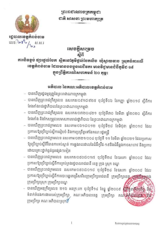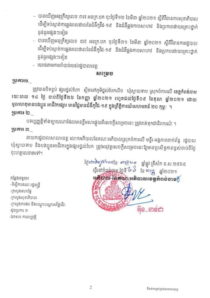 ខេត្តកំពង់ចាម៖ យោងតាមសេចក្ដីប្រកាសព័ត៌មានរបស់ រដ្ឋបាលខេត្តកំពង់ចាម នៅថ្ងៃទី២៧ ខែកញ្ញា ឆ្នាំ២០២១ បានចេញសេចក្តីសម្រេចស្តីពី ការបិទខ្ទប់ផ្សារថ្នល់បែក ស្ថិតនៅភូមិថ្នល់បែកលិច ឃុំស្វាយទាប ស្រុកចំការលើ ខេត្តកពង់ចាម រយៈពេល ១៤ថ្ងៃ ចាប់ពីថ្ងៃទី២៦ ខែកញ្ញា ឆ្នាំ២០២១ រហូតដល់ថ្ងៃទី០៩ ខែតុលា ឆ្នាំ២០២១ ដោយមូលហេតុមានបងប្អូនអាជីវករ លក់ដូរក្នុងផ្សារ មានវិជ្ជមានជម្ងឺកូវីដ-១៩ ក្នុងព្រឹត្តិការណ៍សហគមន៍ ២០ កុម្ភៈ ៕