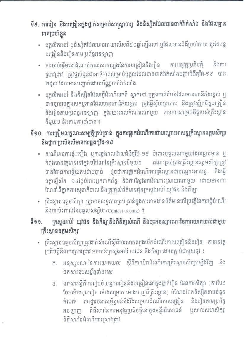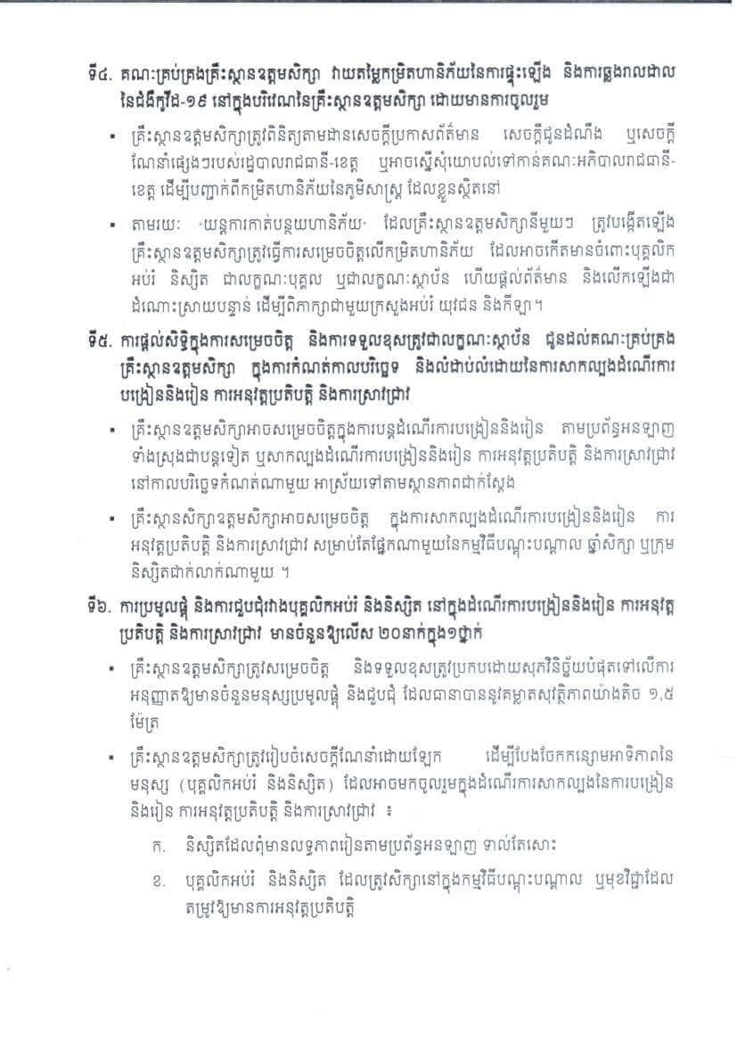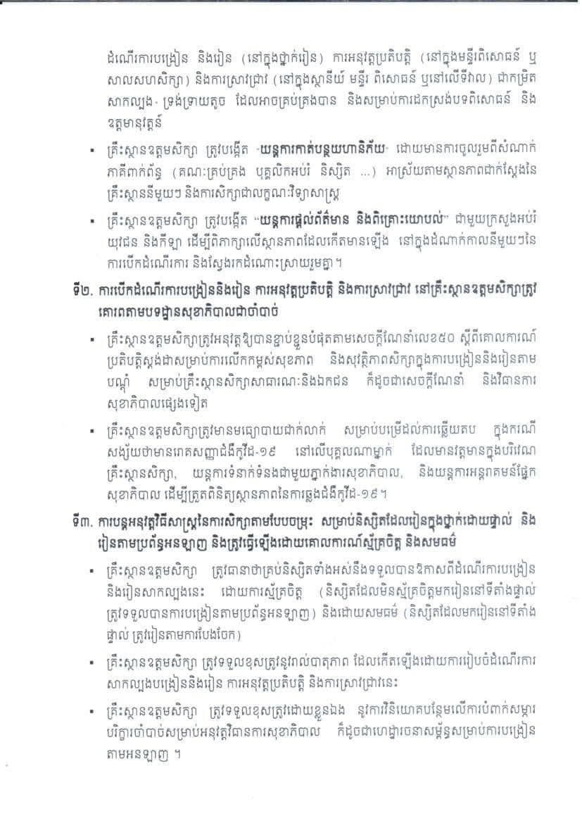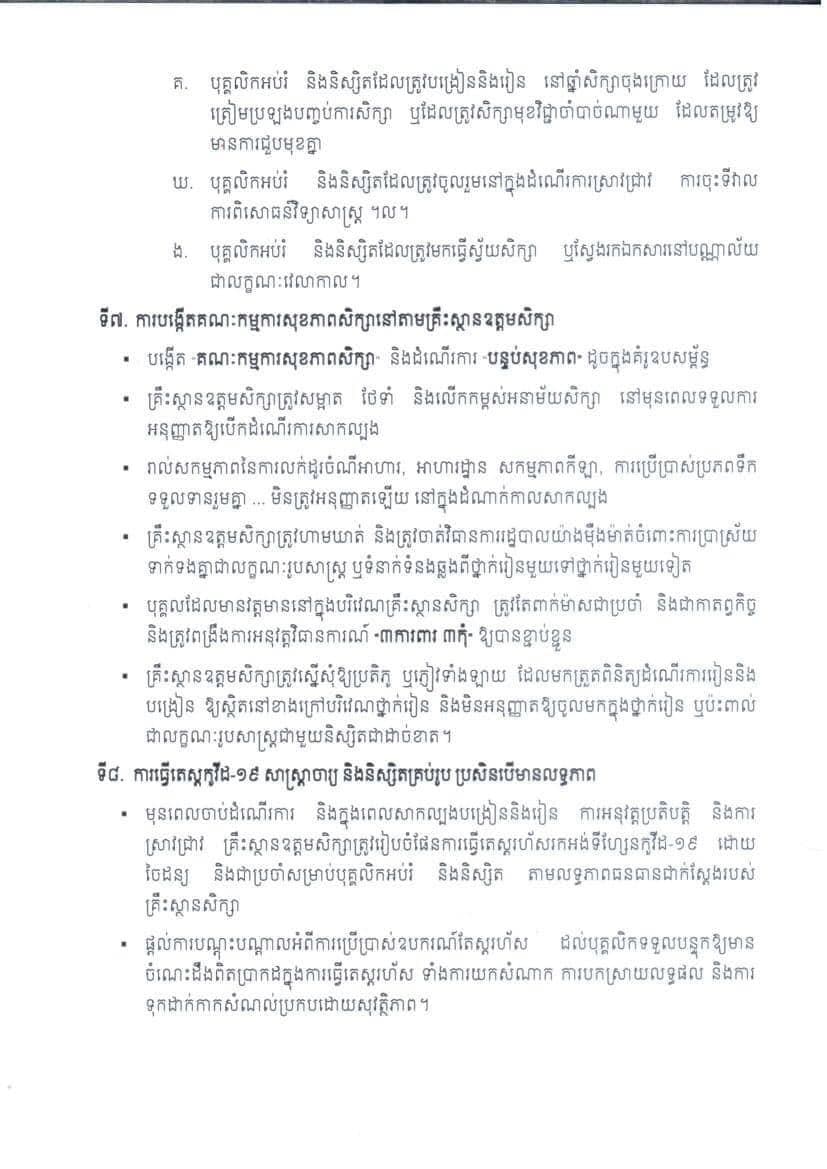 ២. ការបើកដំណើរការបង្រៀននិងរៀន ការអនុវត្តប្រតិបត្តិ និងស្រាវជ្រាវ នៅគ្រឹះស្ថានឧត្ដមសិក្សាត្រូវពោរពតាមបទដ្ឋានសុខាភិបាលជាចាំបាច់