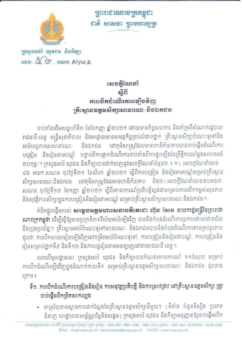 រាជធានីភ្នំពេញ៖ យោងតាមសេចក្ដីប្រកាសព័ត៌មានរបស់ ក្រសួងអប់រំ យុវជន និងកីឡា នៅថ្ងៃទី២៧ ខែកញ្ញា ឆ្នាំ២០២១ ក្រសួងអប់រំ ចេញសេចក្ដីណែនាំ ស្ដីពីការបើកដំណើរការឡើងវិញ គ្រឹះស្ថានឧត្តមសិក្សាសាធារណៈ និងឯកជន បានឲ្យដឹងថា ចាប់តាំងដើមសប្តាហ៍ទី៣ នៃខែកញ្ញា ឆ្នាំ២០២១ ដោយមានកិច្ចសហការ និងគាំទ្រសំណាក់រដ្ឋបាលរាជធានី-ខេត្ត មន្ត្រីសុខាភិបាល និងអាជ្ញាធរសមត្ថកិច្ចគ្រប់លំដាប់ថ្នាក់ គ្រឹះស្ថានសិក្សាចំណេះទូទៅ និងអប់រំបច្ចេកទេសសាធារណៈ និងឯកជន នៅភូមិសាស្ត្រដែលមានហានិភ័យទាបបានចាប់ផ្ដើមដំណើរការបង្រៀន និងរៀនតាមបណ្ដុំ បន្ទាប់ពីការផ្អាកដំណើរការចាប់តាំងពីការផ្ទុះឡើងវិញនៃព្រឹត្តិការណ៍ឆ្លងសហគមន៍ ២០កុម្ភៈ។