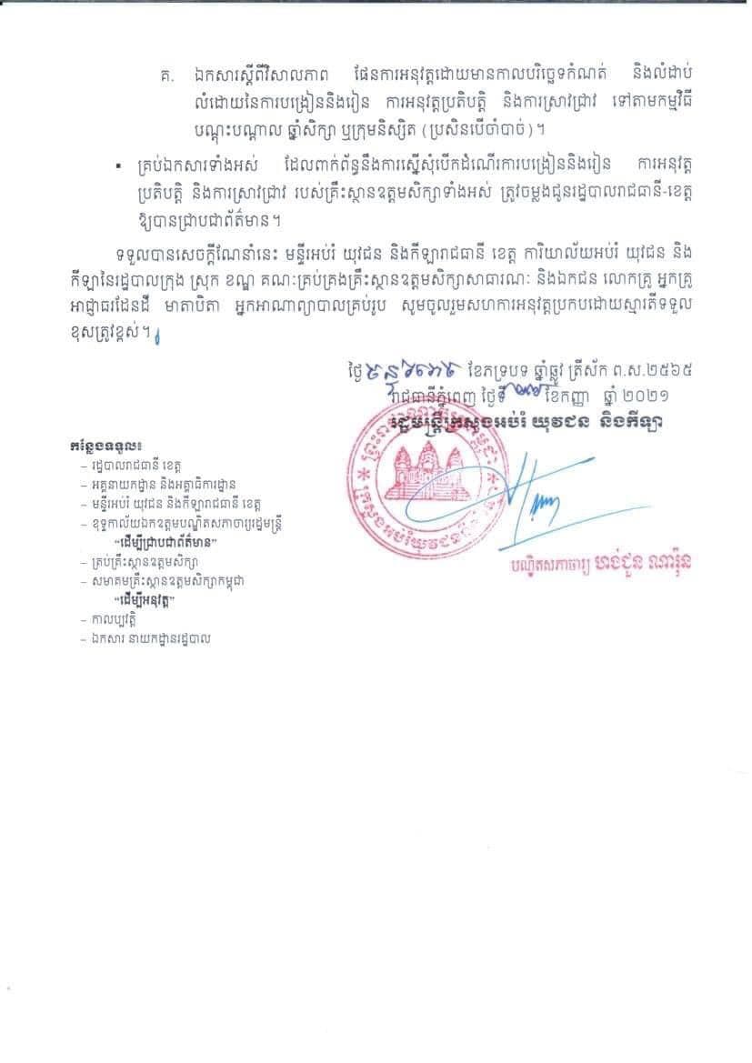 ក្រសួងអប់រំ យុវជន និងកីឡាបានដាក់ចេញនូវសេចក្ដីណែនាំចំនួន ២៖ ១.សេចក្ដីណែនាំចុះថ្ងៃទី៣១ ខែសីហា ឆ្នាំ២០២១ ស្ដីការបង្រៀន និងរៀនតាមបណ្ដុំសម្រាប់គ្រឹះស្ថានសិក្សាសាធារណៈនិងឯកជន នៅភូមិសាស្ត្រដែលមានហានិភ័យទាប និង២.សេចក្ដីណែនាំ ចុះថ្ងៃទី១៣ ខែកញ្ញា ឆ្នាំ២០២១ ស្ដីពីគោលការណ៍ប្រតិបត្តិស្ដង់ដាសម្រាប់ការលើកម្ពស់សុខភាពនិងសុវត្ថិភាពសិក្សាក្នុងការបង្រៀន និងរៀនតាមបណ្ដុំ សម្រាប់គ្រឹះស្ថានសិក្សាសាធារណៈនិងឯកជន។