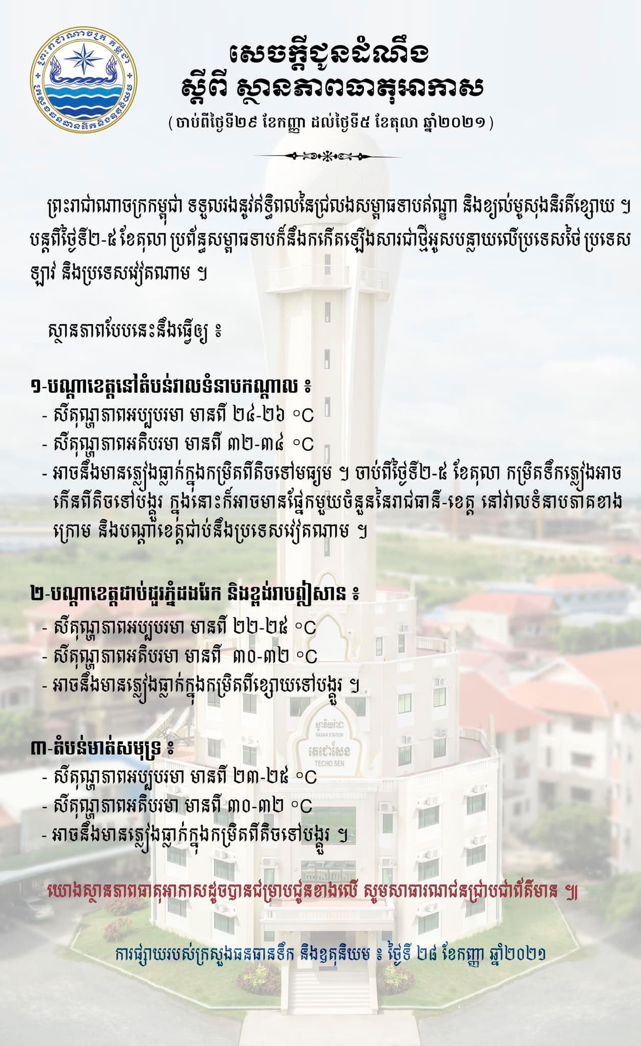 យោងតាមការព្យាករណ៍របស់ ក្រសួងធនធានទឹក និងឧតុនិយម ចាប់ពីថ្ងៃទី២៩ ខែកញ្ញា ដល់ថ្ងៃទី៥ ខែតុលា ឆ្នាំ២០២១ បានឲ្យដឹងថា ព្រះរាជាណាចក្រកម្ពុជា ទទួលរងនូវឥទ្ធិពលជ្រលងសម្ពាធឥណ្ឌា និងខ្យល់មូសុងនិរតីខ្សោយ។ បន្តពីថ្ងៃទី២-៥ ខែតុលា ប្រព័ន្ធសម្ពាធទាបក៏នឹងកើតឡើងសារជាថ្មីអូសបន្លាយលើប្រទេសថៃ ប្រទេសឡាវ និងប្រទេសវៀតណាម។ ស្ថានភាពបែបនេះនឹងធ្វើឲ្យអាកាសធាតុនៅកម្ពុជាមានការប្រែប្រួលដូចខាងក្រោម៖