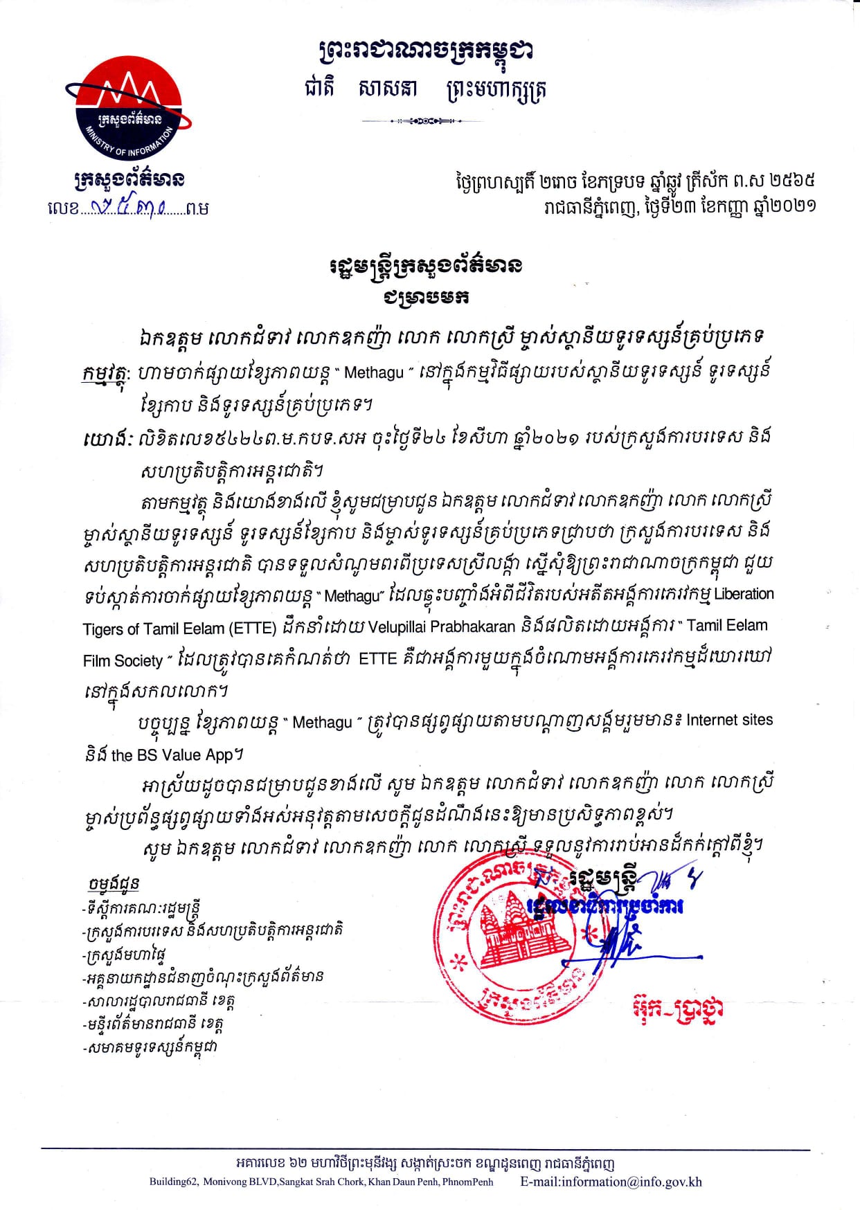រាជធានីភ្នំពេញ៖ យោងតាមការចុះផ្សាយរបស់ ក្រសួងព័ត៌មាន នៅថ្ងៃទី២៩ ខែកញ្ញា ឆ្នាំ២០២១ រដ្ឋមន្ត្រីក្រសួងព័ត៌មាន បានឲ្យដឹងថា ហាមចាក់ផ្សាយខ្សែភាពយន្ត « Methagu » នៅក្នុងវិធីផ្សាយរបស់ស្ថានីយទូរទស្សន៍ ទូរទស្សន៍ខ្សែកាប និងម្ចាស់ទូរទស្សន៍គ្រប់ប្រភេទ ដោយក្រសួងការបរទេស និងសហប្រតិបត្តិការអន្តរជាតិ បានទទួលសំណូមពរពីប្រទេសស្រីលង្កា ស្នើសុំឲ្យព្រះរាជាណាចក្រកម្ពុជា ជួយទប់ស្កាត់ការចាក់ផ្សាយខ្សែភាពយន្ត « Methagu » ដែលឆ្លុះបញ្ចាំងអំពីជីវិតរបស់អតីតអង្គការភេរវកម្ម Liberation Tigers of Tamil Eelam (ETTE) ដឹកនាំដោយ Velupillai Prabhakaran និងផលិតដោយអង្គការ Tamil Eelam Film Society ដែលត្រូវបានគេកំណត់ថា ETTE គឺជាអង្គការមួយក្នុងចំណោមអង្គការភេរវកម្មដ៏ឃោរឃៅនៅក្នុងសកលលោក។