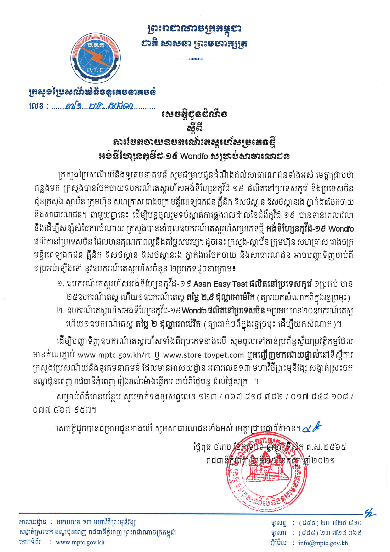 រាជធានីភ្នំពេញ៖ យោងតាមសេចក្ដីប្រកាសរបស់ ក្រសួងប្រៃសណីយ៍ និងទូរគមនាគមន៍ ស្ដីពីការចែកចាយឧបករណ៍តេស្តរហ័សប្រភេទថ្មី អង់ទីហ្សែនកូវីដ-១៩ Wondfo សម្រាប់សាធារណជន ដោយកន្លងមក ក្រសួងបានចែកចាយឧបករណ៍តេស្តរហ័សអង់ទីហ្សែនកូវីដ-១៩ ផលិតនីប្រទេសកូរ៉េ និងប្រទេសចិន ជូនក្រសួង-ស្ថាប័ន ក្រុមហ៊ុន សហគ្រាស រោងចក្រ មន្ទីរពេទ្យឯកជន គ្លីនិក ឱសថស្ថានរង ភ្នាក់ងារចែកចាយនិងសាធារណជន។