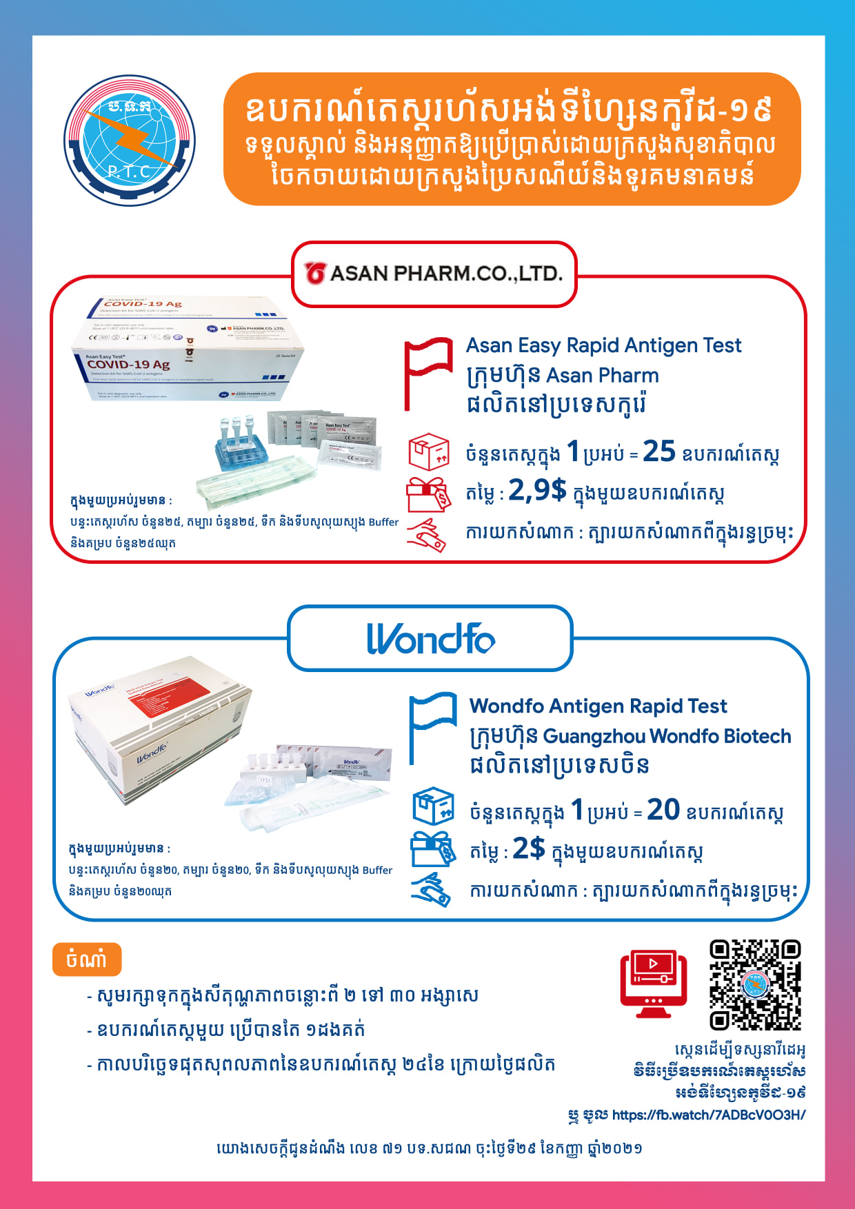 ១.ឧបករណ៍តេស្តរហ័សអង់ទីហ្សែនកូវីដ-១៩ Asan Easy Test ផលិតនៅប្រទេសកូរ៉េ ១ប្រអប់ មាន ២៥ឧបករណ៍តេស្ត ហើយ ១ឧបករណ៍តេស្ត តម្លៃ ២,៩ដុល្លារអាម៉េរិក(ត្បារយកសំណាកពីក្នុងរន្ធច្រមុះ)