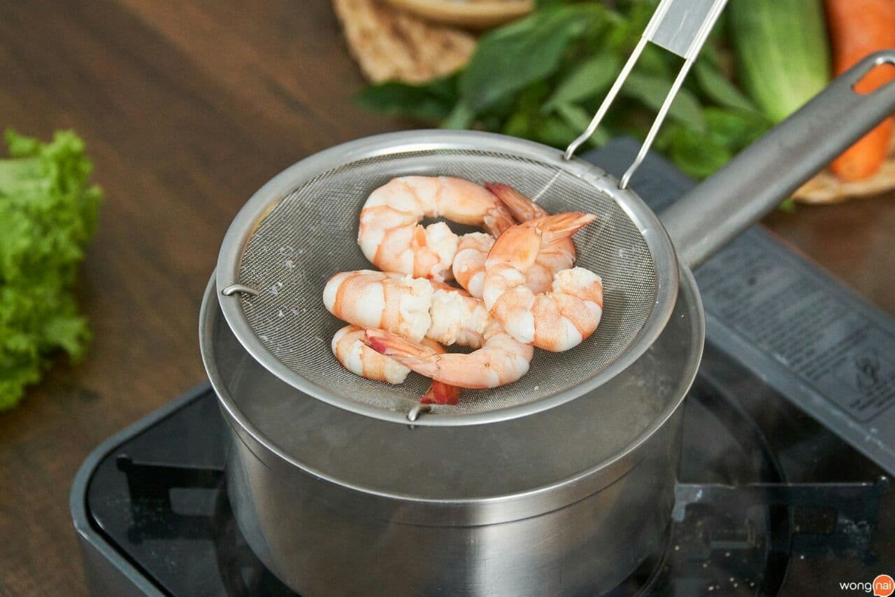 + ដាំទឹកអោយពុះរួចស្រុះបង្គាអោយឆ្អិនល្អ រួចយកបន្ទះគុយទាវកាត់មកកាត់ជាបួនជ្រុង
