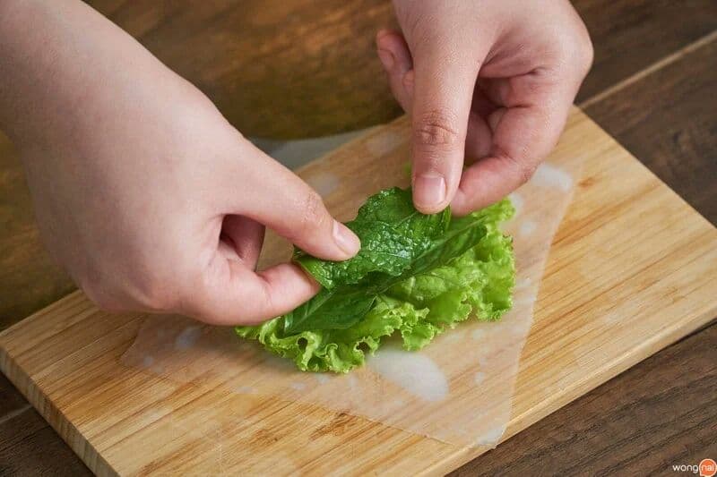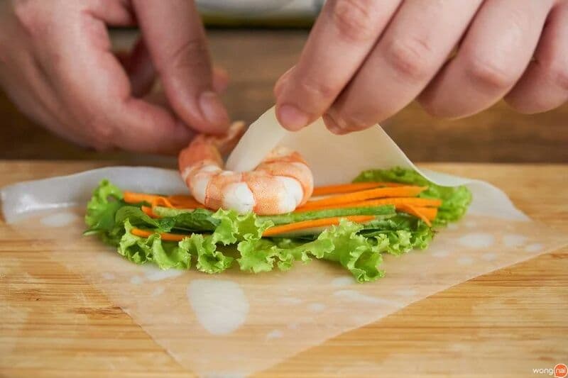 + ក្រោយមកទៀតយើងយកបន្ទះគុយទាវកាត់ដែលបានកាត់រួចមកខ្ចប់បន្លៃសាឡាត់ ជីនាងវង ជីអង្កាម ការ៉ុត ត្រសក់ បង្គា ពីលើ រួចធ្វើការខ្ចប់គុយទាវ អោយមានផ្នែកកន្ទុយបង្គាចេញក្រៅ