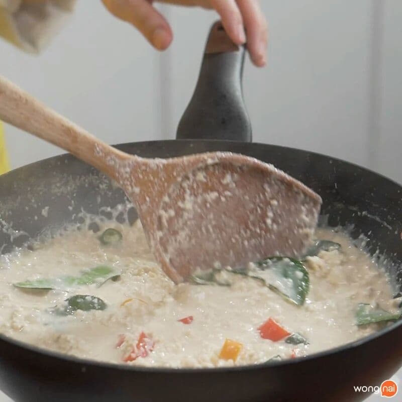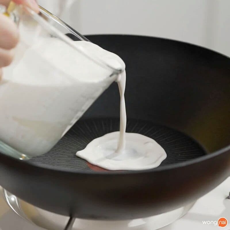 • ក្រោយមកទៀតយើងចាក់ក្បាលខ្ទិះចូលក្នុងខ្ទះ កូរលើភ្លើងល្មម នៅពេលដែលខ្ទិះពុះចាក់គល់ស្លឹកគ្រៃហាន់ល្អិតចូលទៅតាមដោយ តៅហ៊ូដែលយើងបានកិនម៉ត់មុននេះចូលទៅ រួចកូរអោយចូលគ្នា រហូតទាល់តែពុះ