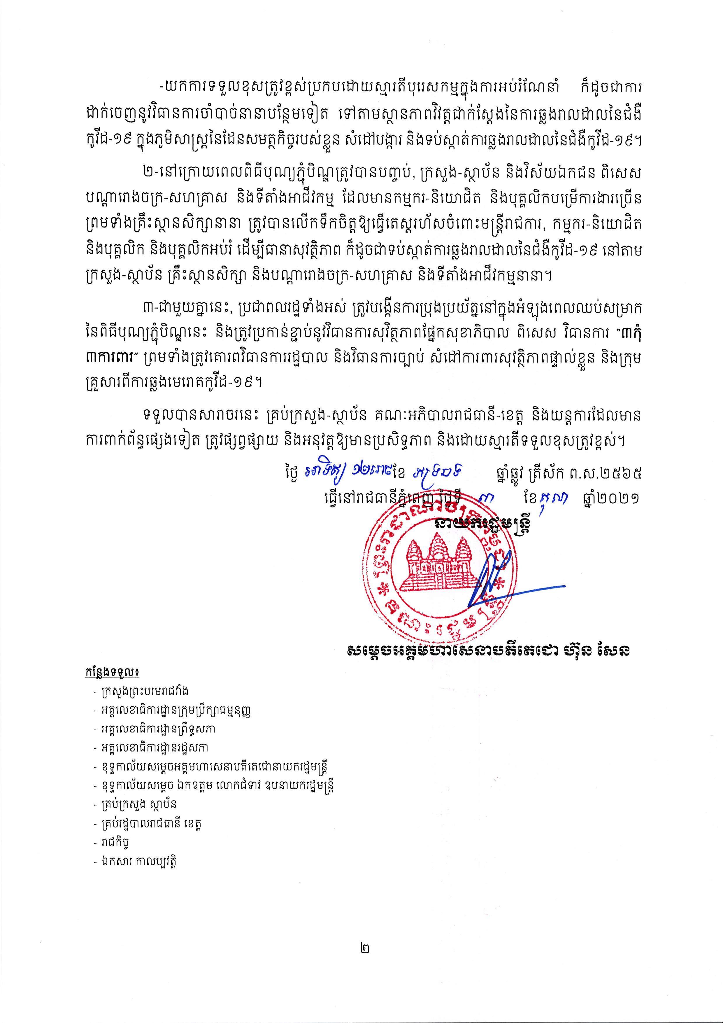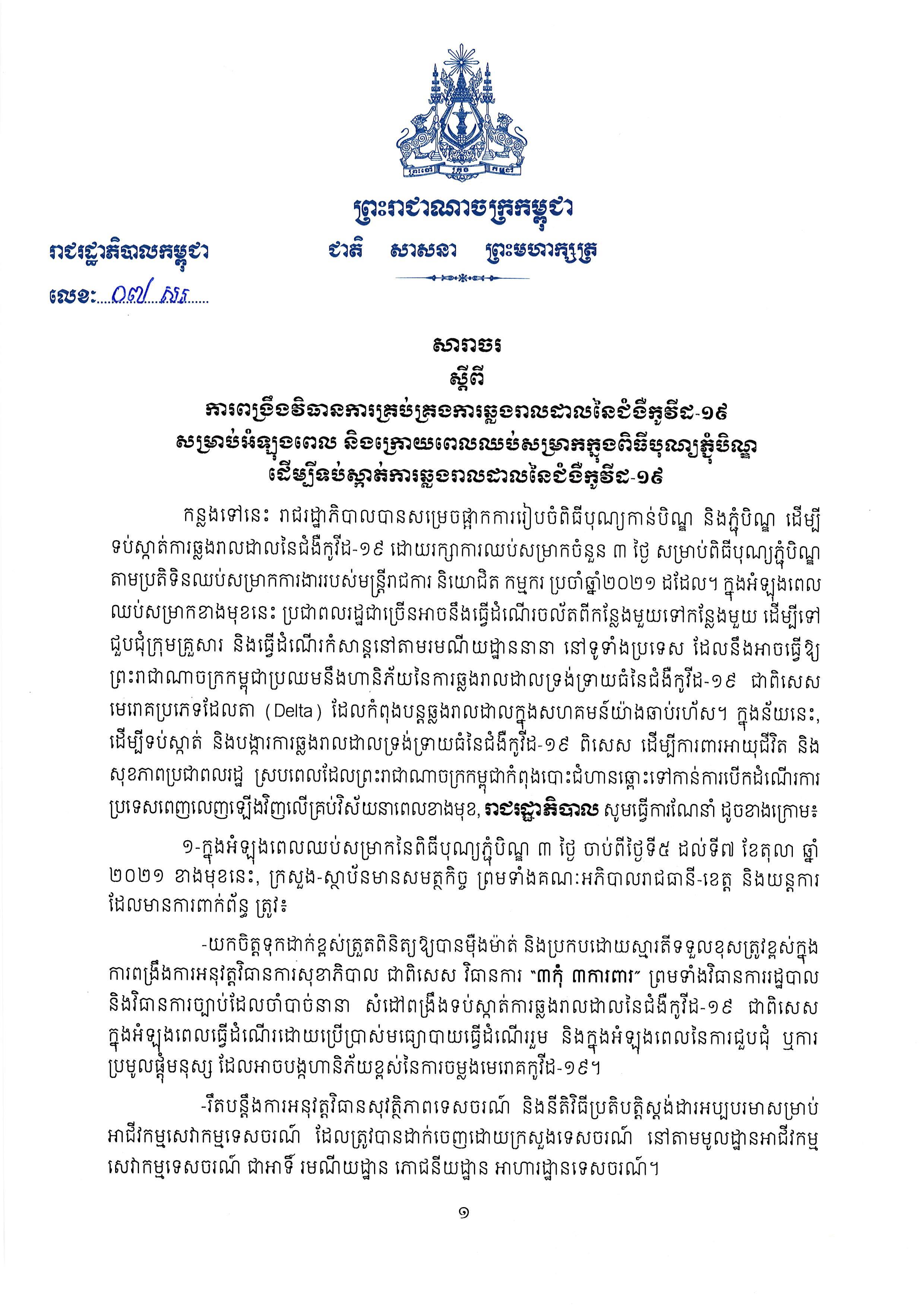 ១- ក្នុងអំឡុងពេលឈប់សម្រាកនៃពិធីបុណ្យភ្ជុំបិណ្ឌ ៣ ថ្ងៃ ចាប់ពីថ្ងៃទី៥ ដល់ទី៧ ខែតុលា ឆ្នាំ ២០២១ ខាងមុខនេះ ក្រសួង-ស្ថាប័នមានសមត្ថកិច្ច ព្រមទាំងគណៈអភិបាលរាជធានី-ខេត្ត និងយន្តការ ដែលមានការពាក់ព័ន្ធត្រូវ៖
