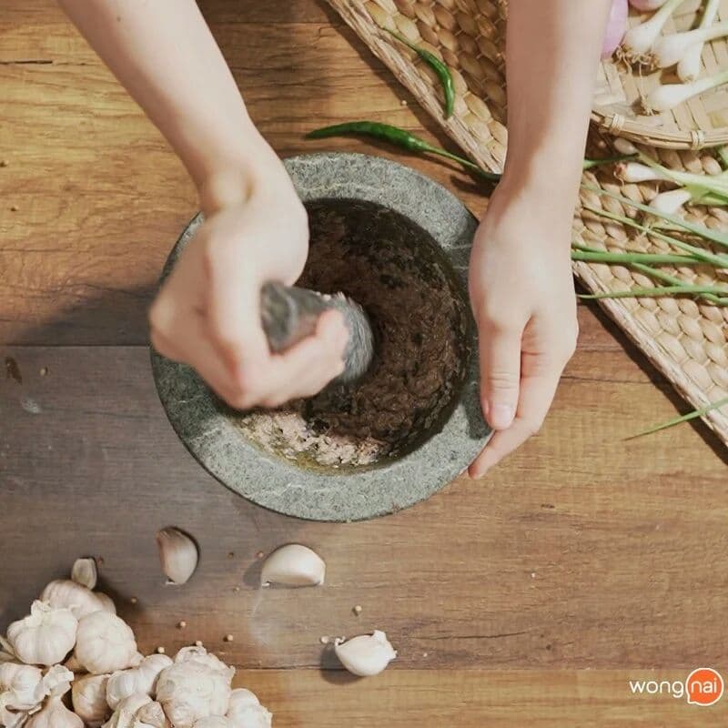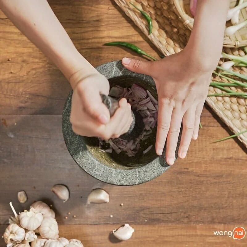 • ជាដំបូងយើងយក ម្រេចស អោយម៉ត់តាមដោយខ្ទឹមក្រហមនិងកាពិបុកចូលគ្នាអោយម៉ត់ល្អ