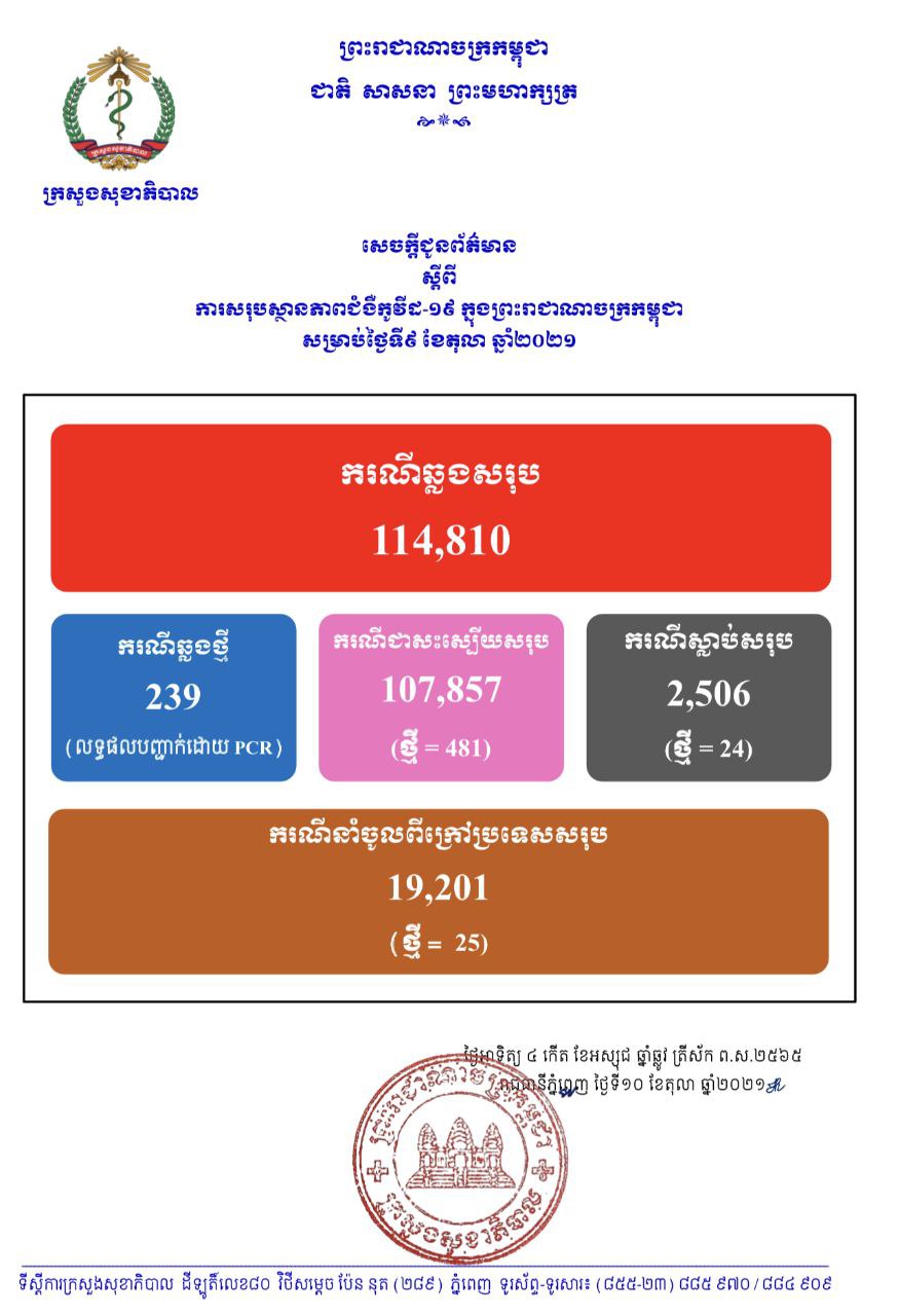យោងតាមសេចក្តីប្រកាសរបស់ក្រសួងសុខាភិបាលកម្ពុជា បានអោយដឹងថានៅថ្ងៃទី០៩ ខែតុលា ឆ្នាំ២០២១ ក្រសួងបានរកឃើញករណីវិជ្ជមានថ្មីដែលបញ្ជាក់លទ្ធផលតេស្ត CPR មានចំនួន ២៣៩នាក់ អ្នកជាសះស្បើយ ៤៨១នាក់ និងស្លាប់២៤នាក់បន្ថែមទៀត។