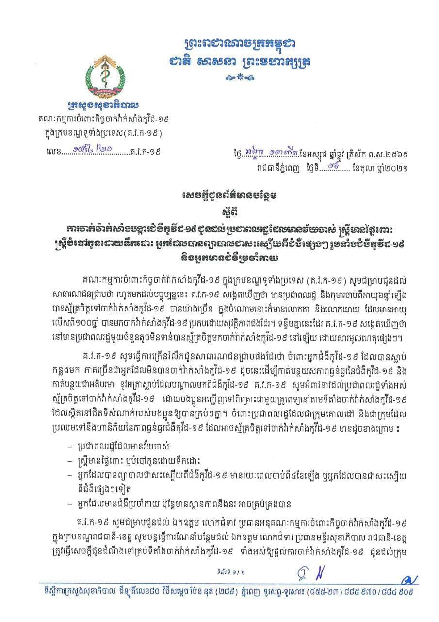 រាជធានីភ្នំពេញ៖ យោងតាមការសេចក្ដីប្រកាសព័ត៌មានរបស់ ក្រសួងសុខាភិបាល គណៈកម្មការចំពោះកិច្ចចាក់វ៉ាក់សាំងកូវីដ-១៩ ក្នុងក្របខណ្ឌទូទាំងប្រទេស(គ.វ.ក-១៩) នៅថ្ងៃទី១៩ ខែតុលា ឆ្នាំ២០២១ ស្ដីពីការចាក់វ៉ាក់សាំងបង្ការជំងឺកូវីដ-១៩ ជូនដល់ប្រជាពលរដ្ឋដែលមានវ័យចាស់ ស្ត្រីមានផ្ទៃពោះ ស្ត្រីបំបៅកូនដោយទឹកដោះ អ្នកដែលបានព្យាបាលជាសះស្បើយពីជំងឺផ្សេងៗ រួមទាំងជំងឺកូវីដ-១៩ និងអ្នកមានជំងឺប្រចាំកាយ។