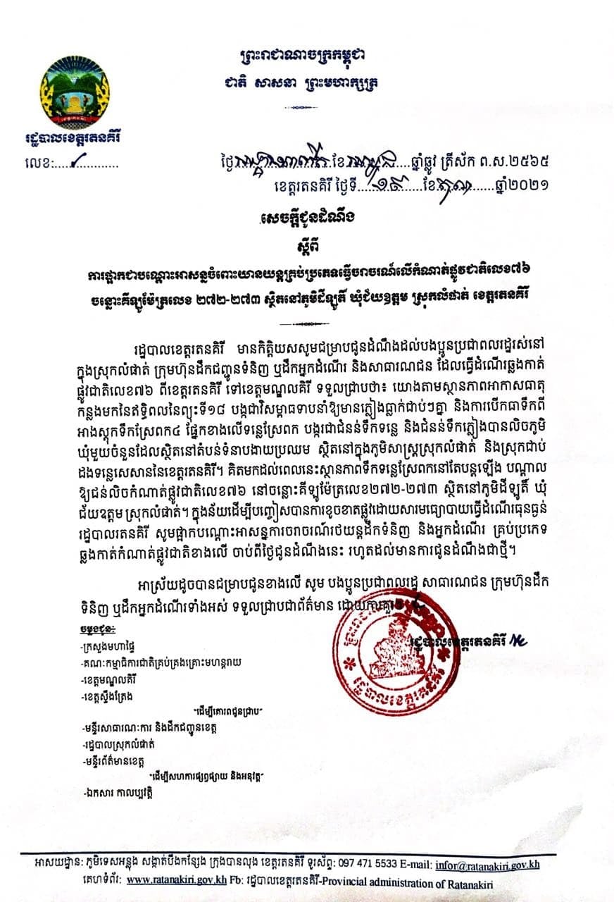 អាជ្ញាធរខេត្តរតនគិរីសម្រេចបិទផ្លូវជាតិលេខ៧៦A ក្នុងស្រុកលំផាត់ជាបណ្ដោះអាសន្ន ដើម្បីធានាសុវត្ថិភាពអ្នកដំណើរ