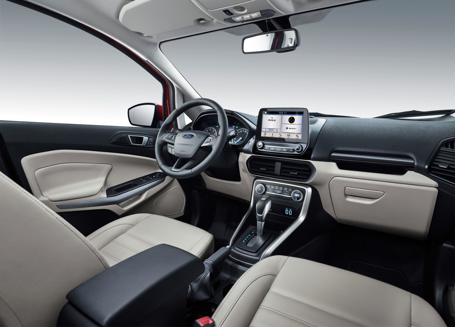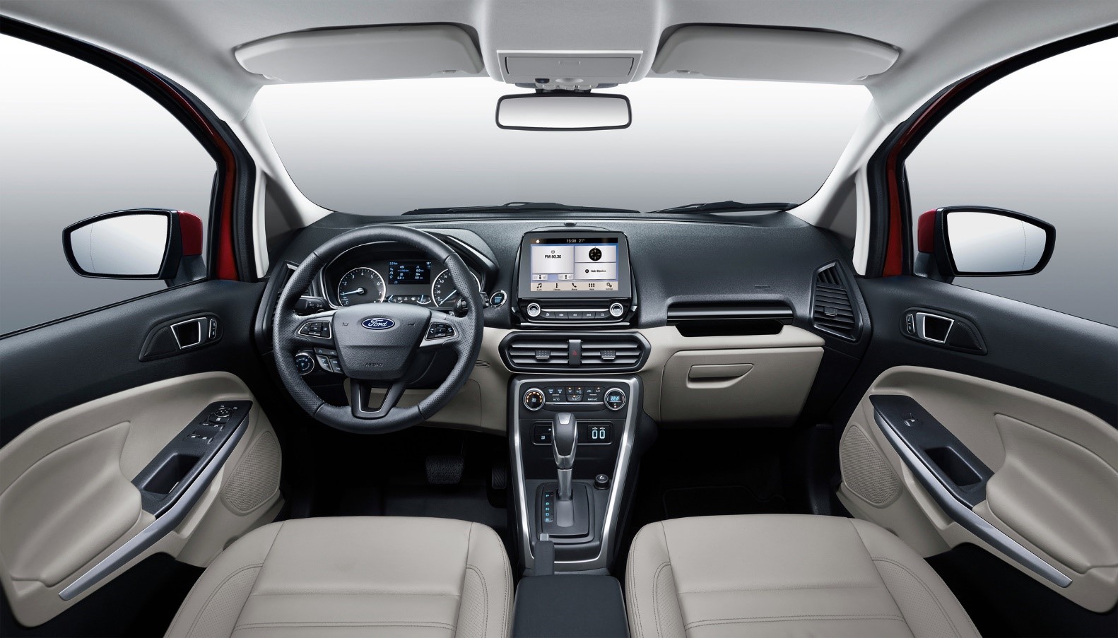 4. ចូលមកដល់ការរចនារូបរាងផ្នែកខាងក្នុងដ៏មានផាសុកភាព អ្វីដែលគួរឲ្យចាប់អារម្មណ៍នោះគឺដំបូលផ្នែកខាងលើស្រលះ ធំ បើប្រៀបធៀបជាមួយរថយន្ដដទៃពេលយើងចូលមកដល់ផ្នែកខាងក្នុងគឺមិនធំស្រលះដូចទៅរថយន្ដ Ford Ecosport ទេ គឺដំបូលផ្នែកខាងលើរបស់ Ford EcoSport មានលក្ខណៈទូលាយស្រឡះល្អ ដែលងាយស្រួលក្នុងការចេញចូលរថយន្ត ការបើកបរផ្លូវជិតផ្លូវឆ្ងាយ បូករួមជាមួយនឹងតាបឡូស្បែកធំទូលាយ ធ្វើឲ្យអ្នកបើកបរ និងអ្នកអមដំណើរមានផាសុកភាព និងមិនងាយពុលឡាននោះទេ។