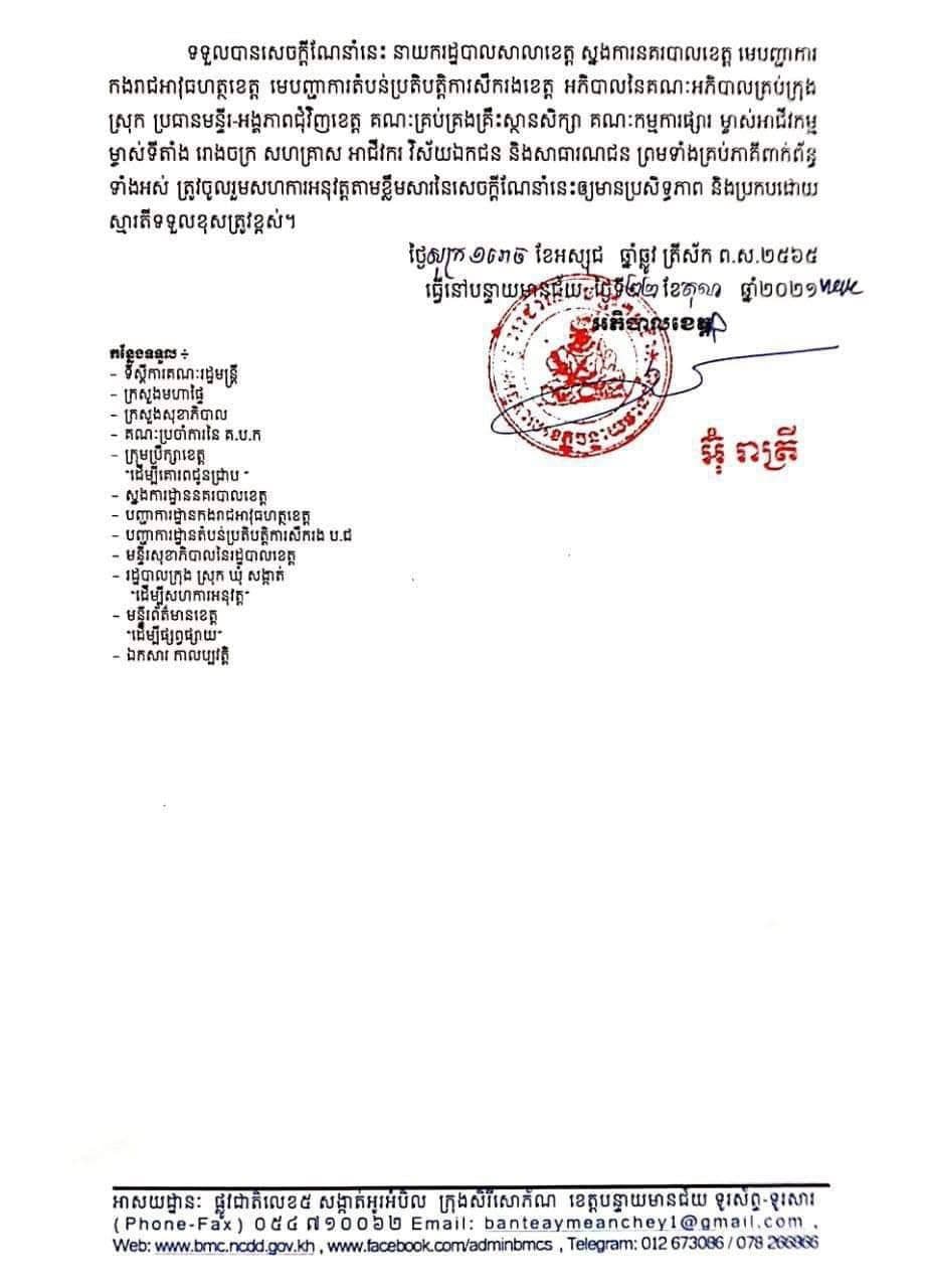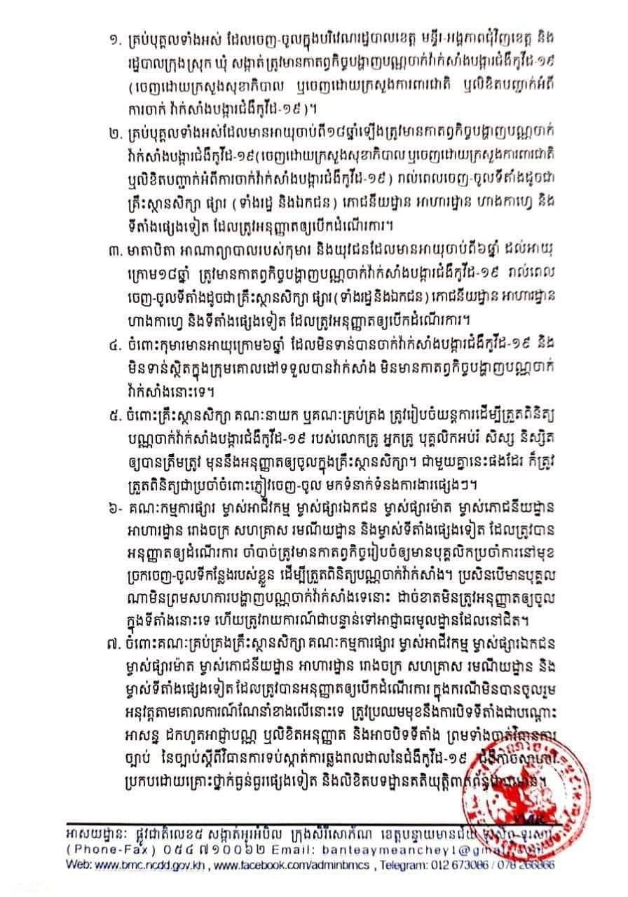 ក្នុងន័យនេះ ដើម្បីបង្ការ និងទប់ស្កាត់ការឆ្លងរាលដាលនៃជំងឺកូវីដ-១៩ ក៏ដូចជាការបង្កើតឲ្យបាននូវ ” ភាពស៊ាំក្នុងសហគមន៍ ឲ្យមានភាពរឹងមាំ ដើម្បីទប់ស្កាត់ការឆ្លងរាលដាលនៃជំងឺកូវីដ-១៩ ” ក្នុងភូមិសាស្ត្រខេត្តបន្ទាយមានជ័យ និងឈានទៅរកការបើកដំណើរការឡើងវិញលើគ្រប់វិស័យ នាពេលឆាប់ៗខាងមុខនេះ រដ្ឋបាលខេត្ត សូមធ្វើការណែនាំដល់ រដ្ឋបាលក្រុង ស្រុក មន្ទីរ-អង្គភាព គណៈគ្រប់គ្រងគ្រឹះស្ថានសិក្សា គណៈកម្មការផ្សារ ម្ចាស់អាជីវកម្ម រោងចក្រ សហគ្រាស មន្ត្រីរាជការ អាជីវករ និងប្រជាពលរដ្ឋទាំងអស់ក្នុងខេត្ត ដូចខាងក្រោម៖