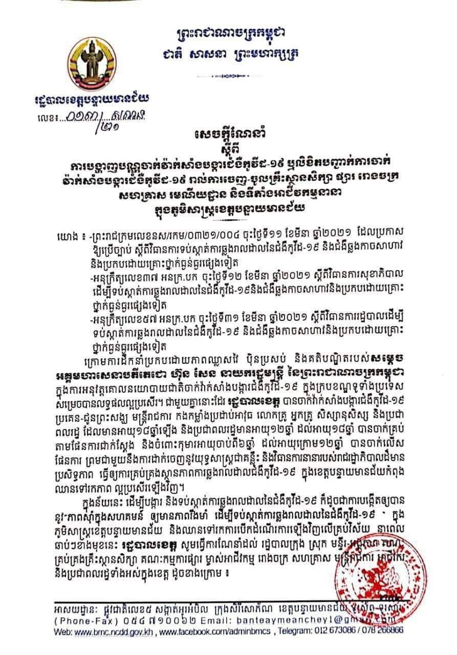 រដ្ឋបាលខេត្តបន្ទាយមានជ័យ ណែនាំឱ្យបង្ហាញបណ្ណចាក់វ៉ាក់សាំងកូវីដ-១៩ រាល់ការចេញ-ចូលតាមគ្រឹះស្ថានសិក្សា រោងចក្រ ផ្សារ សហគ្រាស រមណីយដ្ឋាន និងទីតាំងអាជីវកម្មនានា
