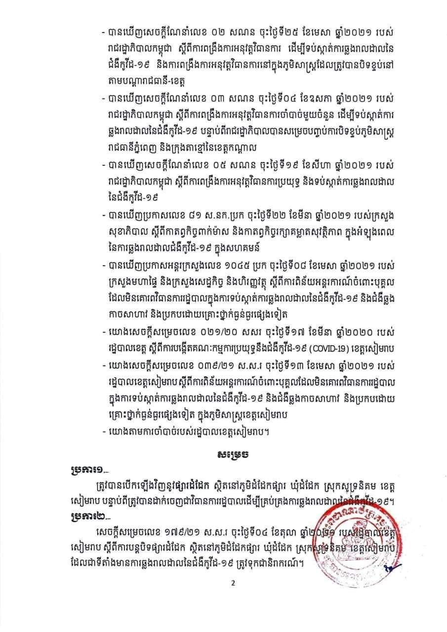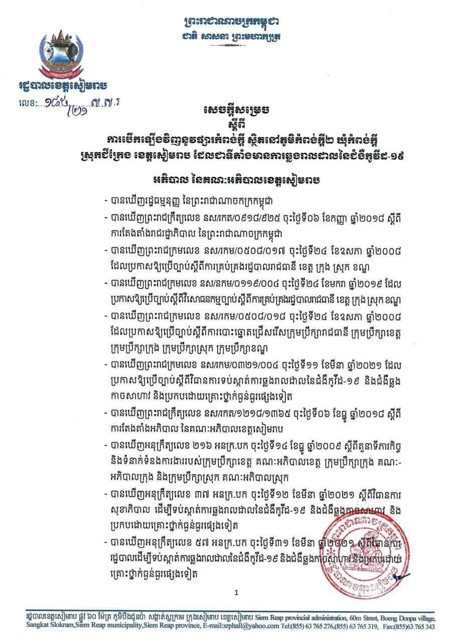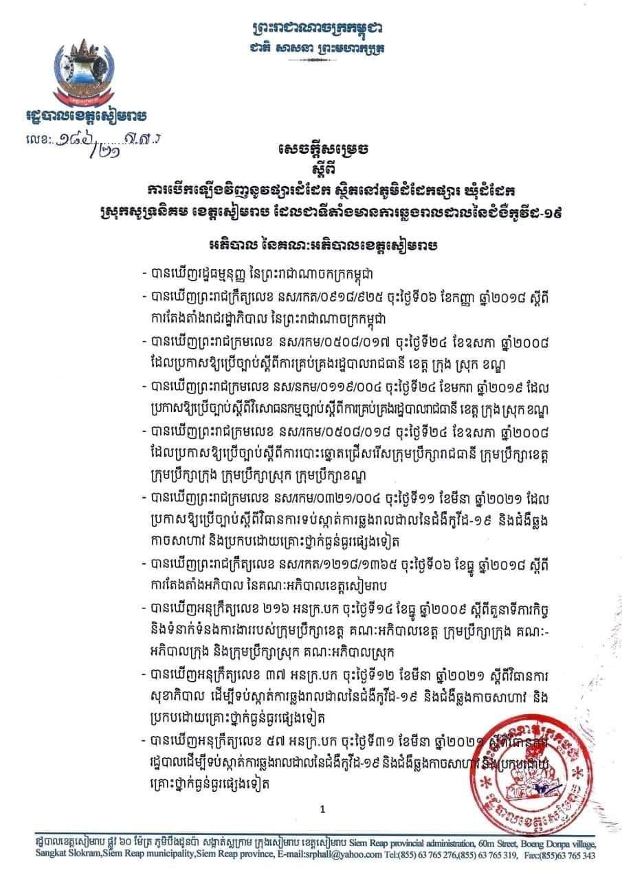 ខេត្តសៀមរាប៖ យោងតាមការចុះផ្សាយរបស់ រដ្ឋបាលខេត្តសៀមរាប បានសម្រេចបើកឡើងវិញនូវផ្សារចំនួន ៣ ក្នុងភូមិសាស្ត្រខេត្តសៀមរាបមាន ផ្សាររលួស ផ្សារដំដែក និងផ្សារកំពង់ក្តី ដែលជាទីតាំងមានការឆ្លងជំងឺកូវីដ-១៩។
