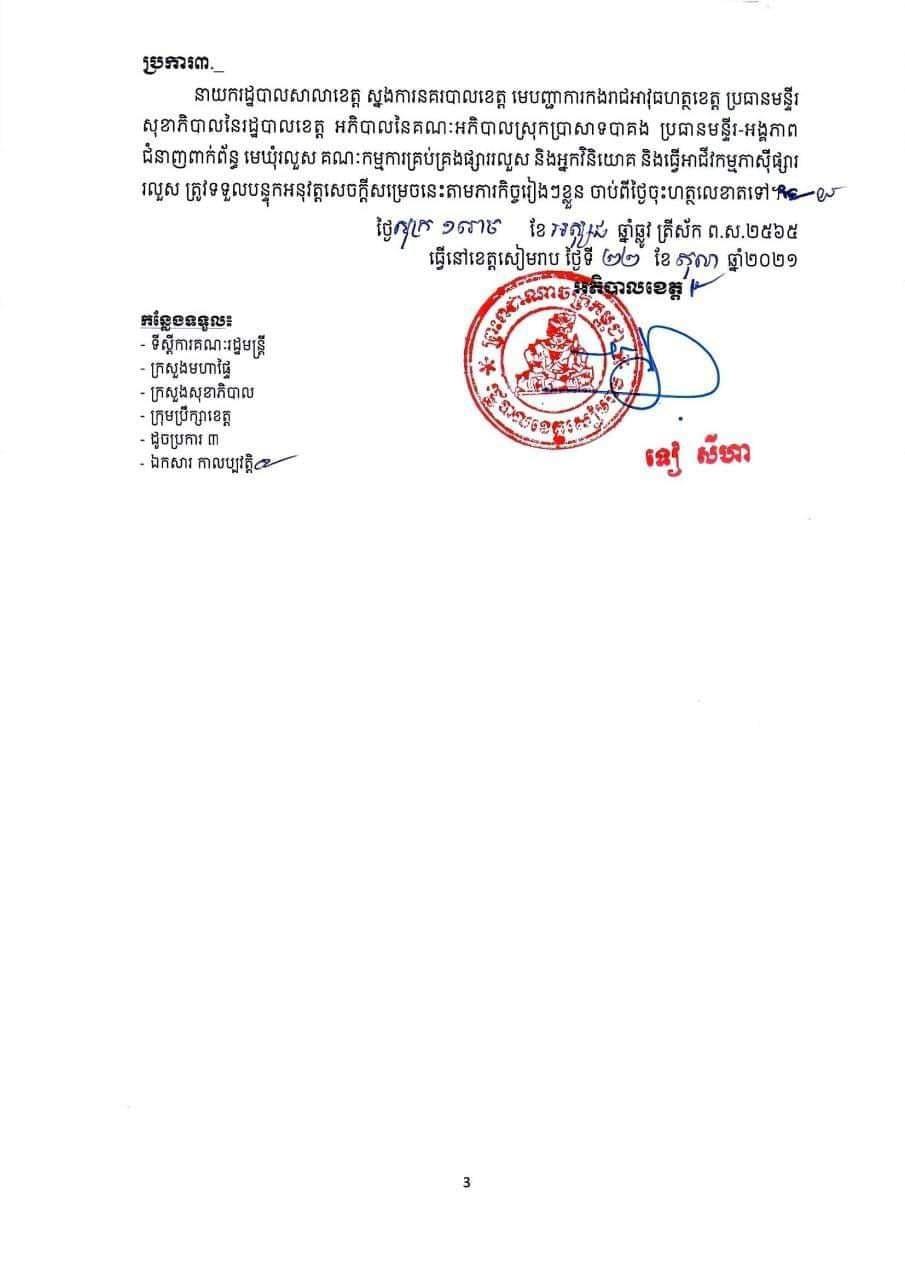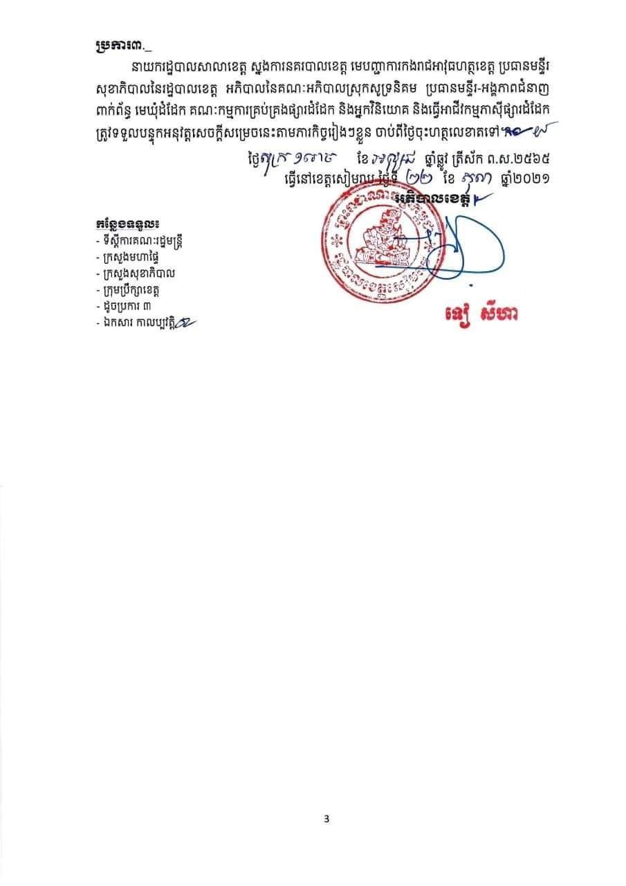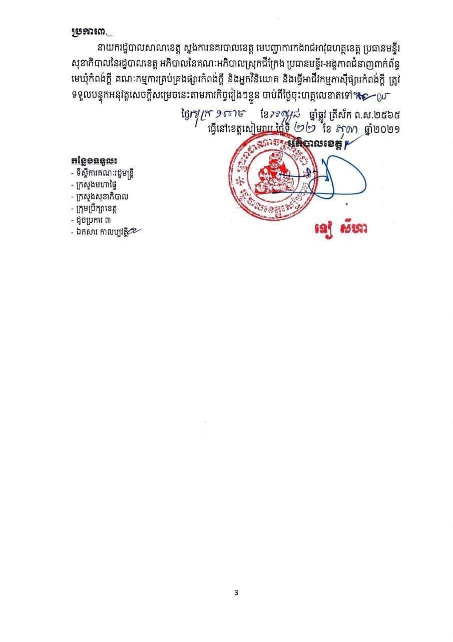 ខេត្តសៀមរាប៖ យោងតាមការចុះផ្សាយរបស់ រដ្ឋបាលខេត្តសៀមរាប បានសម្រេចបើកឡើងវិញនូវផ្សារចំនួន ៣ ក្នុងភូមិសាស្ត្រខេត្តសៀមរាបមាន ផ្សាររលួស ផ្សារដំដែក និងផ្សារកំពង់ក្តី ដែលជាទីតាំងមានការឆ្លងជំងឺកូវីដ-១៩។