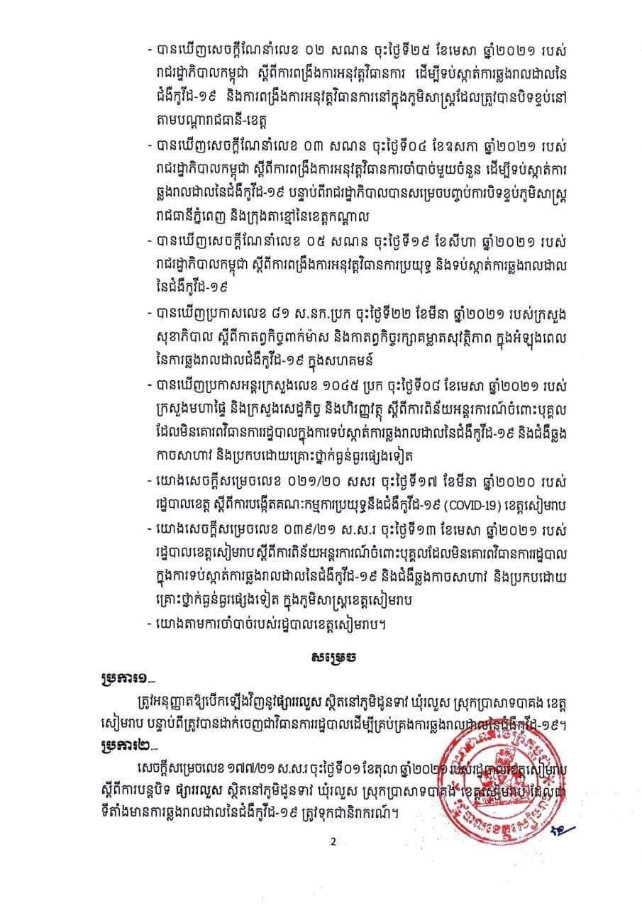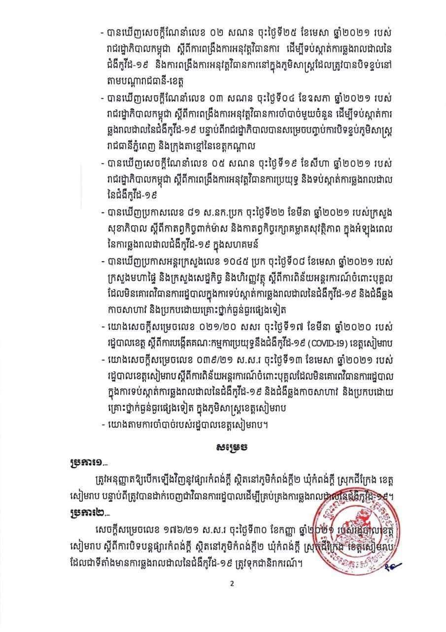 រដ្ឋបាលខេត្តសៀមរាប បានឲ្យដឹងថា រដ្ឋបាលខេត្ត ត្រូវបានបើកឡើងវិញនូវផ្សារចំនួន ៣ មានដូចជា៖ ផ្សាររលួស ដែលស្ថិតក្នុងភូមិដូនទាវ ឃុំរលួស ស្រុកប្រាសាទបាគង ខេត្តសៀមរាប, ផ្សារដំដែក​ ដែលស្ថិតក្នុងភូមិដំដែកផ្សារ ឃុំដំដែក ស្រុកសូទ្រនិគម ខេត្តសៀមរាប​ និង ផ្សារកំពង់ក្តី ដែលស្ថិតក្នុងភូមិកំពង់ក្តី២ ឃុំកំពង់ក្តី ស្រុកជីក្រែង ខេត្តសៀមរាប បន្ទាប់ពីត្រូវបានដាក់ចេញជាវិធានការរដ្ឋបាល ដើម្បីគ្រប់គ្រងការឆ្លងរាលដាលនៃជំងឺកូវីដ-១៩ ៕