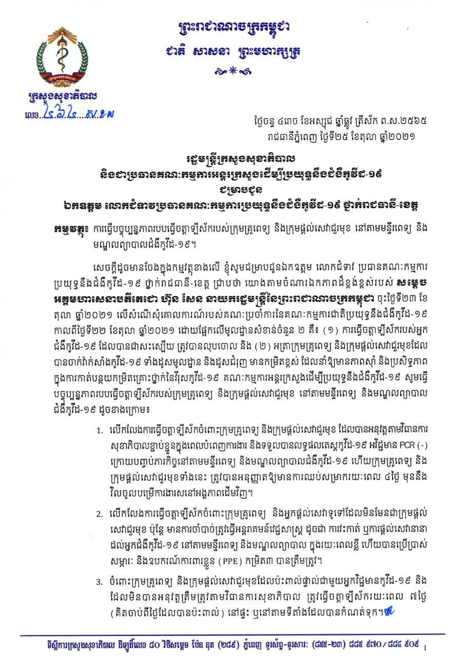 រាជធានីភ្នំពេញ៖ យោងតាមសេចក្ដីប្រកាសព័ត៌មានរបស់ ក្រសួងសុខាភិបាល នៅថ្ងៃទី២៥ ខែតុលា ឆ្នាំ២០២១ ស្ដីពីការធ្វើបច្ចុប្បន្នភាពរបបធ្វើចត្តាឡីស័ករបស់គ្រូពេទ្យ និងក្រុមផ្តល់សេវាជួរមុខ នៅតាមមន្ទីរពេទ្យ និងមណ្ឌលព្យាបាលជំងឺកូវីដ-១៩ ឲ្យបានជ្រាបថា យោងតាមចំណារឯកភាពដ៏ខ្ពង់ខ្ពស់របស់ សម្តេច អគ្គមហាសេនាបតីតេជោ ហ៊ុន សែន នាយករដ្ឋមន្ត្រីនៃព្រះរាជាណាចក្រកម្ពុជា ចុះថ្ងៃទី២៣ ខែតុលា ឆ្នាំ២០២១ លើសំណើសុំគោលការណ៍របស់គណៈប្រចាំការនៃគណៈកម្មការជាតិប្រយុទ្ធនឹងជំងឺកូវីដ-១៩ កាលពីថ្ងៃទី២២ ខែតុលា ឆ្នាំ២០២១ ដោយផ្អែកលើមូលដ្ឋានសំខាន់ចំនួន២ គឺ៖