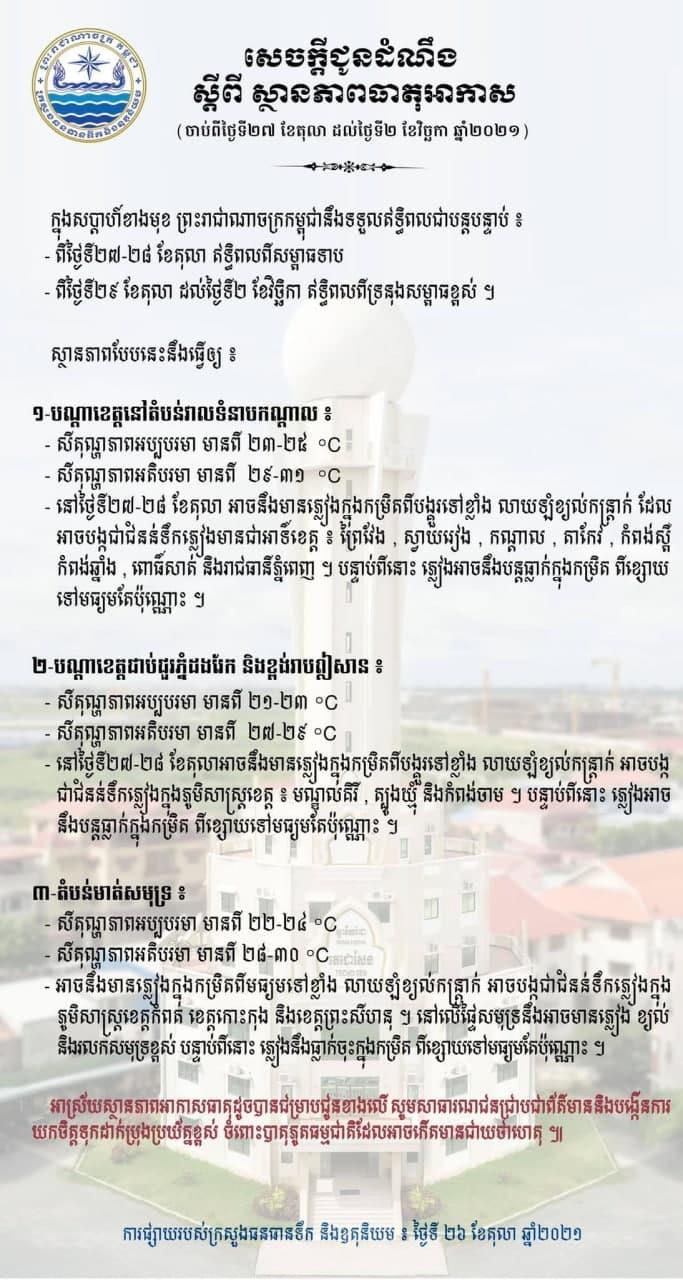 រាជធានីភ្នំពេញ៖ យោងតាមសេចក្ដីជូនដំណឹងរបស់ ក្រសួងធនធានទឹក និងឧតុនិយម នៅថ្ងៃទី២៦ ខែតុលា ឆ្នាំ២០២១ ស្ដីពីស្ថានភាពធាតុអាកាស ចាប់ពីថ្ងៃទី២៧​ ខែតុលា ដល់ថ្ងៃទី០២ ខែវិច្ឆិកា ឆ្នាំ២០២១ បានឲ្យដឹងថា ក្នុងសប្តាហ៍ខាងមុខ ព្រះរាជាណាចក្រកម្ពុជា នឹងទទួលឥទ្ធិពលជាបន្តបន្ទាប់៖