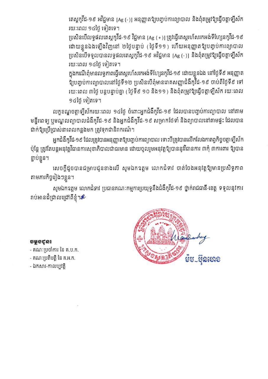 គណៈកម្មការអន្តរក្រសួងដើម្បីប្រយុទ្ធនឹងជំងឺកូវីដ-១៩ សូមធ្វើការលើកលែងកាតព្វកិច្ចធ្វើចត្តាឡីស័កចំពោះអ្នកជំងឺកូវីដ-១៩ ដែលបានបញ្ចប់ការព្យាបាលដូចខាងក្រោម៖