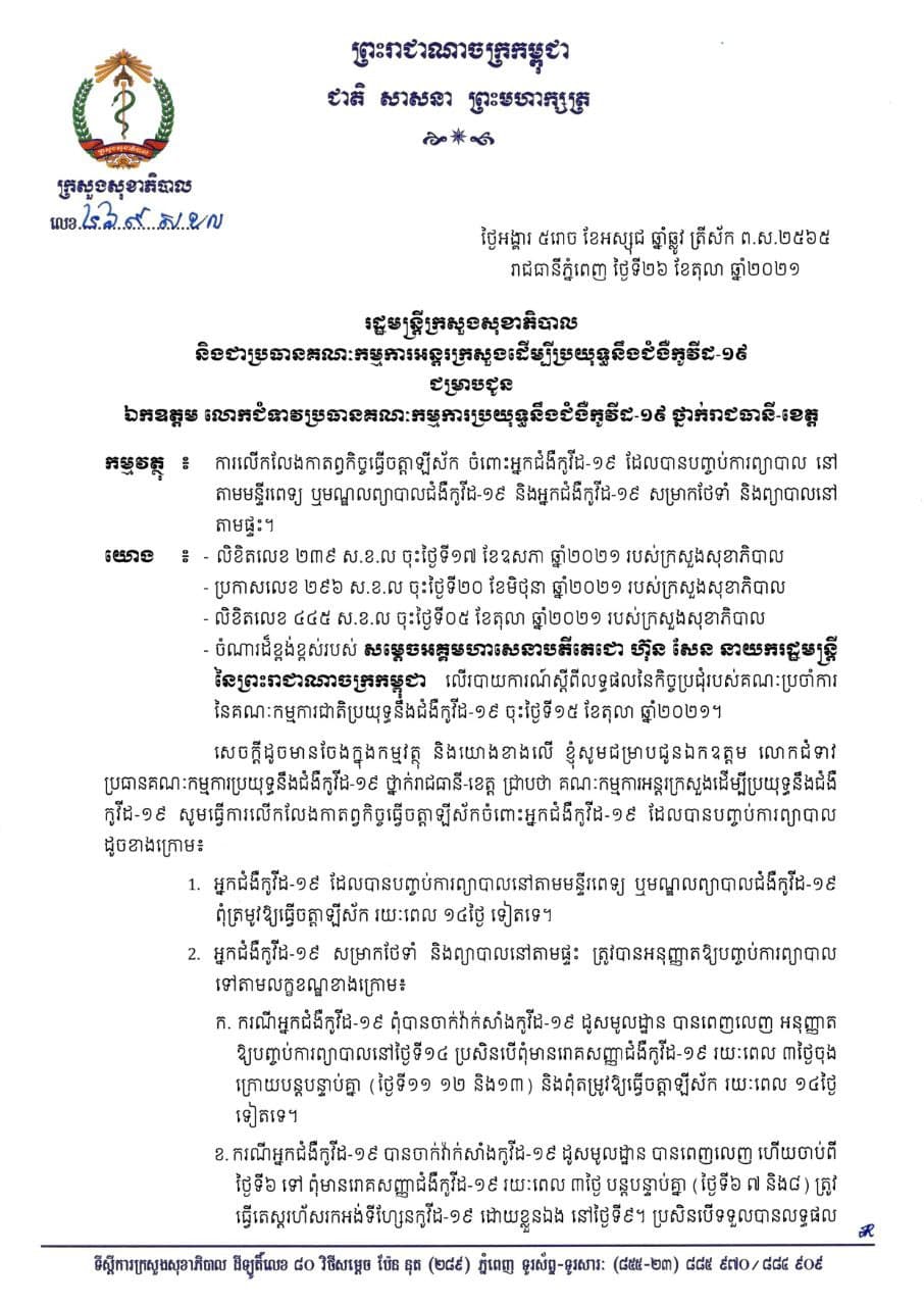 រាជធានីភ្នំពេញ៖ យោងតាមការចុះផ្សាយរបស់ ក្រសួងសុខាភិបាល នៅថ្ងៃទី២៦ ខែតុលា ឆ្នាំ២០២១ ស្ដីពីការលើកលែងកាតព្វកិច្ចធ្វើចត្តាឡីស័កចំពោះអ្នកជំងឺកូវីដ-១៩ ដែលបានបញ្ចប់ការព្យាបាល នៅតាមមន្ទីរពេទ្យ ឬមណ្ឌលព្យាបាលជំងឺកូវីដ-១៩ និងអ្នកជំងឺកូវីដ-១៩ សម្រាកថែទាំ និងព្យាបាលនៅតាមផ្ទះ ដោយលោកជំទាវ ប្រធានគណៈកម្មការប្រយុទ្ធនឹងជំងឺកូវីដ-១៩ ថ្នាក់រាជធានី-ខេត្ត ឲ្យបានជ្រាបថា៖