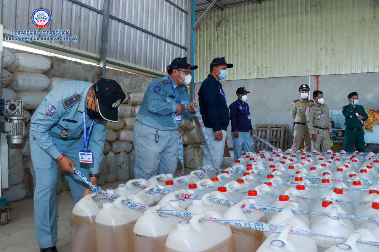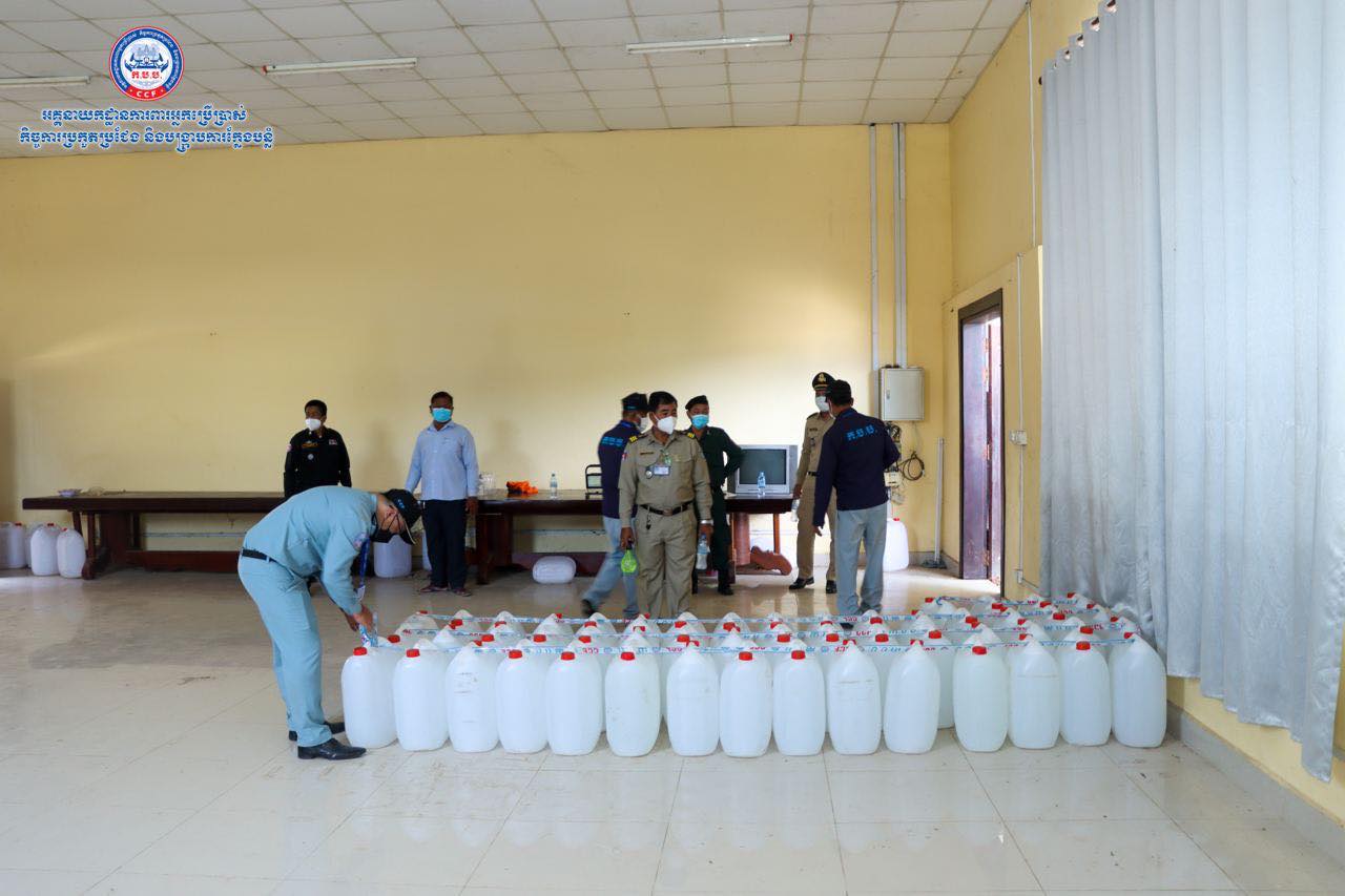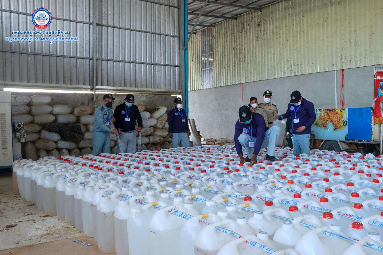 (រាជធានីភ្នំពេញ)៖ យោងតាមការចុះផ្សាយរបស់ អគ្គ.ការពារអ្នកប្រើប្រាស់ កិច្ចការប្រកួតប្រជែង និងបង្ក្រាបការក្លែងបន្លំ បានឲ្យដឹងថា នៅថ្ងៃទី២៥ ខែតុលា ឆ្នាំ២០២១ មន្រ្តីស៊ើបអង្កេតរបស់អគ្គនាយកដ្ឋាន ក.ប.ប. បានចុះប្រតិបត្តិការត្រួតពិនិត្យគុណភាពអាល់កុល នៅទីតាំងមួយកន្លែង ក្នុងភូមិសាស្ត្រខណ្ឌពោធិ៍សែនជ័យ រាជធានីភ្នំពេញ។ ប្រតិបត្តិការនេះ បានធ្វើឡើងបន្ទាប់ពីមន្រ្តីជំនាញបានធ្វើការស្រាវវជ្រាវរកឃើញថា ទីតាំងនេះមានស្តុកទុក ដើម្បីចែកចាយលក់អាល់កុលនៅតាមបណ្តាទីផ្សារនៅទូទាំងប្រទេស។ បន្ទាប់ពីបានត្រួតពិនិត្យ មន្រ្តីជំនាញបានរកឃើញអាល់កុលក្លែងក្លាយ(មេតាណុល) ចំនួន ១៥៧ប៊ីដុង ស្មើនឹង៤ ៧១០លីត្រ នៅទីតាំងផ្ទះមួយកន្លែងស្ថិតនៅក្នុងសង្កាត់ចោមចៅ ខណ្ឌពោធិ៍សែនជ័យ រាជធានីភ្នំពេញ។