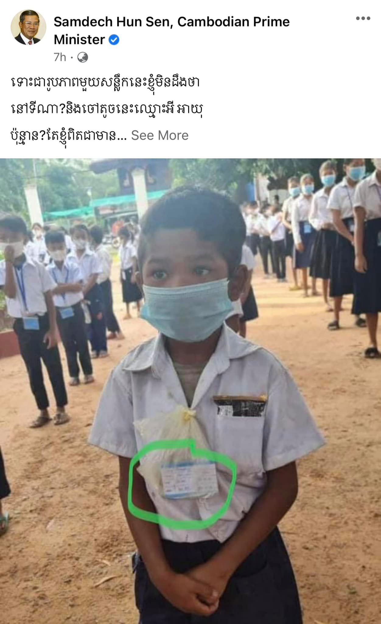 កាលពីពេលថ្មីៗនេះ មានការចែកចាយតៗគ្នាជាច្រើននៅក្នុងបណ្តាញសង្គមហ្វេសប៊ុកទាក់ទងនឹងរូបភាពរបស់ក្មេងប្រុសម្នាក់ ដែលស្លៀកពាក់ឯកសណ្ឋានសិស្ស ហើយមានចង់កាតចាក់វ៉ាក់សាំងក្នុងថង់ជាប់នឹងអាវ និងមិនមានស្បែកជើងពាក់នោះ រហូតទទួលការចាប់អារម្មណ៍ពីសំណាក់សម្តេចតេជោ នាយករដ្ឋមន្ត្រី។