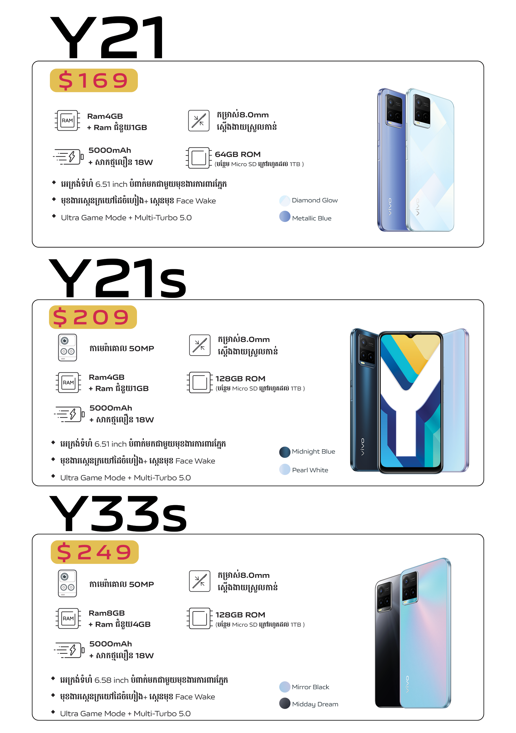 មួយរយៈកន្លងមកនេះគឺគិតចាប់ផ្តើមពី ខែសីហា មកដល់ ខែវិច្ឆិកា ឆ្នាំ2021 ក្នុងរយៈពេល 3ខែនេះ ក្រុមហ៊ុនផលិតស្មាតហ្វូន vivo ប្រចាំប្រទេសកម្ពុជាបានធ្វើការបង្ហាញចេញនូវវត្តមានស្មាតហ្វូនរបស់ខ្លួនចំនួន 3ម៉ូឌែល នៃត្រកូល Y Series គឺមានដូចជាស្មាតហ្វូនម៉ូឌែល vivo Y21 / Y21s / Y33s ។