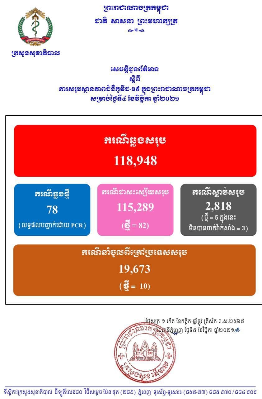 នៅថ្ងៃទី05 ខែវិច្ឆិកា ឆ្នាំ2021នេះ ក្រសួងសុខាភិបាលកម្ពុជា បានចេញសេចក្តីជូនដំណឹងពី ការរកឃើញករណីវិជ្ជមានវីរុសកូវីដ១៩ថ្មី ចំនួន 78នាក់ (លទ្ធផលបញ្ជាក់ដោយ PCR) ខណៈអ្នកបានជាសះស្បើយថ្មីមានចំនួន 82នាក់ និងមានអ្នកបាត់បង់ជីវិតថ្មី 5នាក់ (មិនបានចាក់វ៉ាក់សាំង 3នាក់) គិតមកទល់ពេលនេះ ករណីឆ្លងកូវីដ១៩ សរុបនៅក្នុងប្រទេសកម្ពុជា មានចំនួន 118,948នាក់, ករណីជាសះស្បើយសរុប 115,289នាក់ និងស្លាប់សរុប 2,818នាក់៕