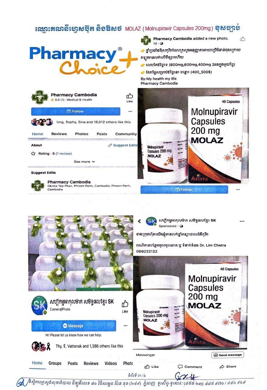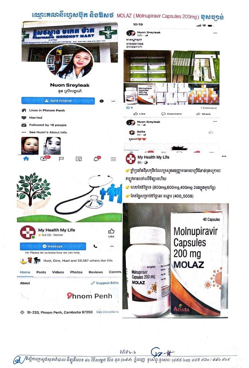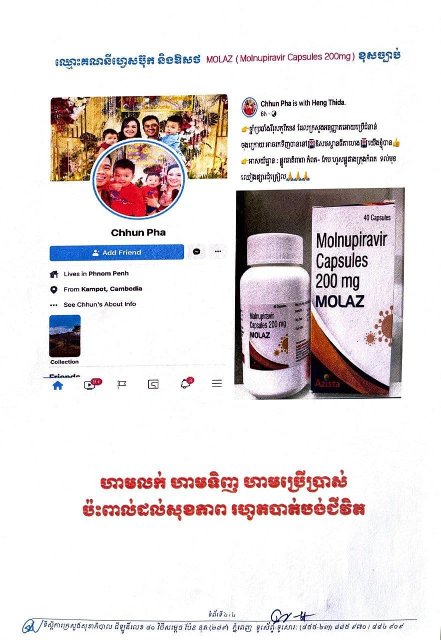 រាជធានីភ្នំពេញ៖ យោងតាមសេចក្តីជូនព័ត៌មានរបស់ ក្រសួងសុខាភិបាល នៅថ្ងៃទី០៦ ខែវិច្ឆិកា ឆ្នាំ២០២១ ស្តីពីការហាមឃាត់គណនីបណ្តាញសង្គមហ្វេសប៊ុកដែលកំពុងផ្សព្វផ្សាយ លក់ផលិតផលគ្មានលេខបញ្ជិកាពីក្រសួងសុខាភិបាល គណនីបណ្ដាញសង្គមហ្វេសប៊ុកឈ្មោះ៖ ១.Nuon Sreyleak, ២.My Healty My Life, ៣.Pharmacy Cambodia, ៤.សិប្បកម្មអាល់កុលម៉ាក់ សមិទ្ធិផលខ្មែរ SK ៥.Chhun Pha, គណនីបណ្ដាញសង្គមហ្វេសប៊ុកមួយចំនួនទៀត និងឱសថស្ថានមួយចំនួន កំពុងលក់ឱសថសម្រាប់ប្រឆាំងវីរុសកូវីដ-១៩ ឈ្មោះ MOLAZ (Molnupiravir Capsules 200mg)គ្មានប្រភពច្បាស់លាស់។