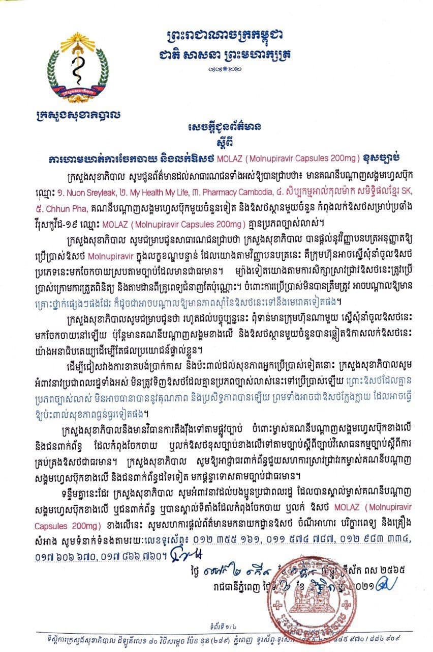 ក្រសួងសុខាភិបាលសូមជម្រាបសាធារណជនជ្រាបថា ក្រសួងសុខាភិបាល បានផ្ដល់នូវវិញ្ញាបនបត្រអនុញ្ញាឲ្យប្រើប្រាស់ឱសថ Molnupiravir ក្នុងលក្ខខណ្ឌបន្ទាន់ ដែលយោងតាមវិញ្ញាបនបត្រនេះ គឺក្រុមហ៊ុន អាចស្នើសុំនាំចូលឱសថ ប្រភេទនេះមកចែកចាយស្របតាមច្បាប់ដែលមានជាធរមាន។ ម្យ៉ាងទៀតយោងតាមការសិក្សាស្រាវជ្រាវឱសថនេះត្រូវប្រើប្រាស់ក្រោមការត្រួតពិនិត្យ និងតាមដានពីគ្រូពេទ្យជំនាញតែប៉ុណ្ណោះ។ ចំពោះការប្រើប្រាស់មិនបានត្រឹមត្រូវ អាចបណ្ដាលឲ្យមានគ្រោះថ្នាក់ផ្សេងៗផងដែរ ក៏ដូចជាអាចបណ្ដាលឲ្យមានភាពស៊ាំនៃឱសថនេះទៅនឹងមេរោគទៀតផង។