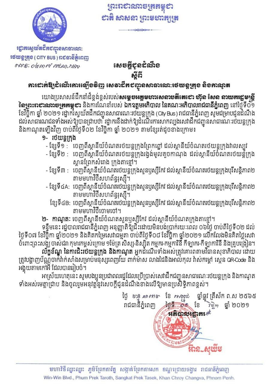 ដោយយោងតាមប្រសាសន៍ដ៏ខ្ពង់ខ្ពស់របស់សម្តេចអគ្គមហាសេនាបតីតេជោ ហ៊ុន សែន នាយករដ្ឋមន្ត្រីនៃព្រះរាជណាចក្រកម្ពុជា និងការណែនាំរបស់ ឯកឧត្តមអភិបាល នៃគណៈអភិបាលរាជធានីភ្នំពេញ នៅថ្ងៃទី០១ ខែវិច្ឆិកា ឆ្នាំ២០២១ រដ្ឋាករស្វយ័តដឹកជញ្ជូនសាធារណៈរថយន្តក្រុង (City Bus) រាជធានីភ្នំពេញ សូមជម្រាបជូនដំណឹងដល់សាធារណជនទាំងអស់ឲ្យបានជ្រាបថា រដ្ឋាករនឹងដាក់ឲ្យដំណើរការសាកល្បងសេវាដឹកជញ្ជូនសាធារណៈរថយន្តក្រុង និងកាណូតឡើងវិញ ចាប់ពីថ្ងៃទី០២ ខែវិច្ឆិកា ឆ្នាំ២០២១ តាមខ្សែរត់ដូចខាងក្រោម៖