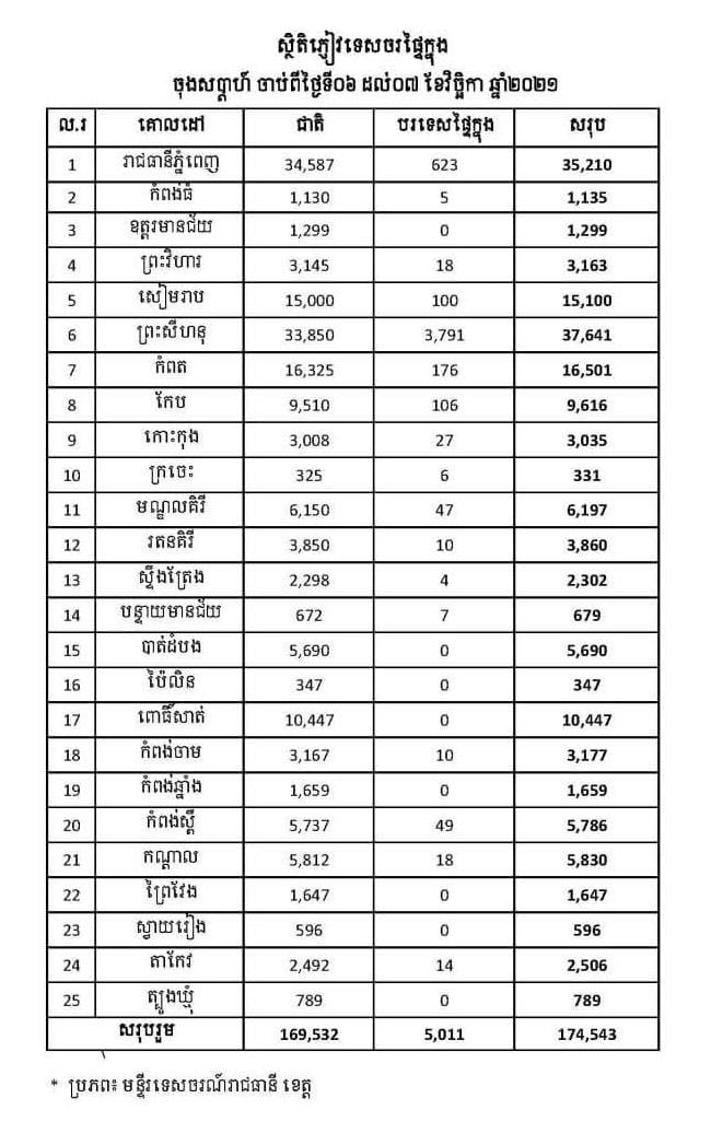 រាជធានីភ្នំពេញ៖ យោងតាមការចុះផ្សាយរបស់ ក្រសួងទេសចរណ៍ នៅថ្ងៃទី០៨ ខែវិច្ឆិកា ឆ្នាំ២០២១ បានឲ្យដឹងថា ចរន្តភ្ញៀវទេសចរដែលចេញដើរកម្សាន្តនៅទូទាំងប្រទេសនៅតែមានការកើនឡើង ដោយចាប់ពីថ្ងៃទី០៦-០៧ ខែវិច្ឆិកា ឆ្នាំ២០២១ កម្ពុជាទទួលបានភ្ញៀវសរុប ១៧៤,៥៤៣នាក់ ក្នុងនោះភ្ញៀវទេសចរជាតិ ១៦៩,៥៣២នាក់ និងភ្ញៀវបរទេសផ្ទៃក្នុង ៥,០១១នាក់។