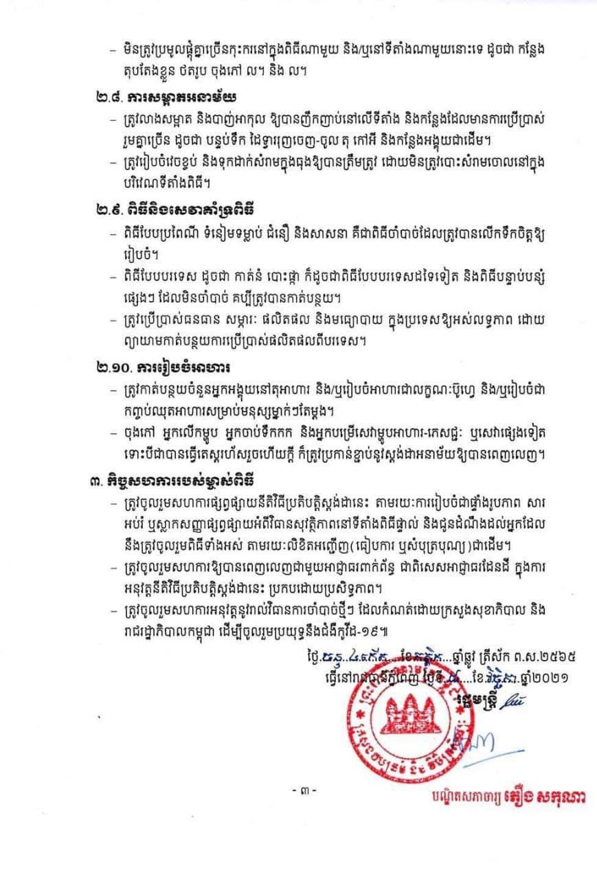 យោងតាមលិខិតរបស់ ក្រសួងវប្បធម៌ និងវិចិត្រសិល្បៈ បានចេញនីតិវិធីប្រតិបត្តិស្តង់ដា (SOP) ស្តីពីការរៀបចំពិធីអាពាហ៍ពិពាហ៍ និងពិធីបុណ្យប្រពៃណីនានា ក្នុងព្រះរាជាណាចក្រកម្ពុជា ដោយកំណត់ចំនួនអ្នកចូលរួម យ៉ាងច្រើនបំផុត ២០០នាក់។ លិខិតរបស់ក្រសួងដែលបានចុះថ្ងៃទី០៨ ខែវិច្ឆិកា ឆ្នាំ២០២១ បានបញ្ជាក់អោយម្ចាស់កម្មវិធីធ្វើការដាក់ពាក្យស្នើសុំ និងធ្វើលិខិតធានាអះអាង ថាបានអនុវត្តវិធានការការពារបានត្រឹមត្រូវ ព្រមទាំងហ៊ានទទួលខុសត្រូវចំពោះមុខច្បាប់ថែមទៀតផង។