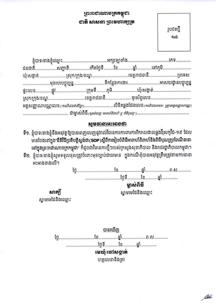 អ្នកចង់រៀបការ សូមធ្វើការដាក់ពាក្យស្នើសុំ និងធ្វើលិខិតធានាអះអាង ថាបានអនុវត្តវិធានការការពារបានត្រឹមត្រូវ ហើយហ៊ានទទួលខុសត្រូវមុខច្បាប់