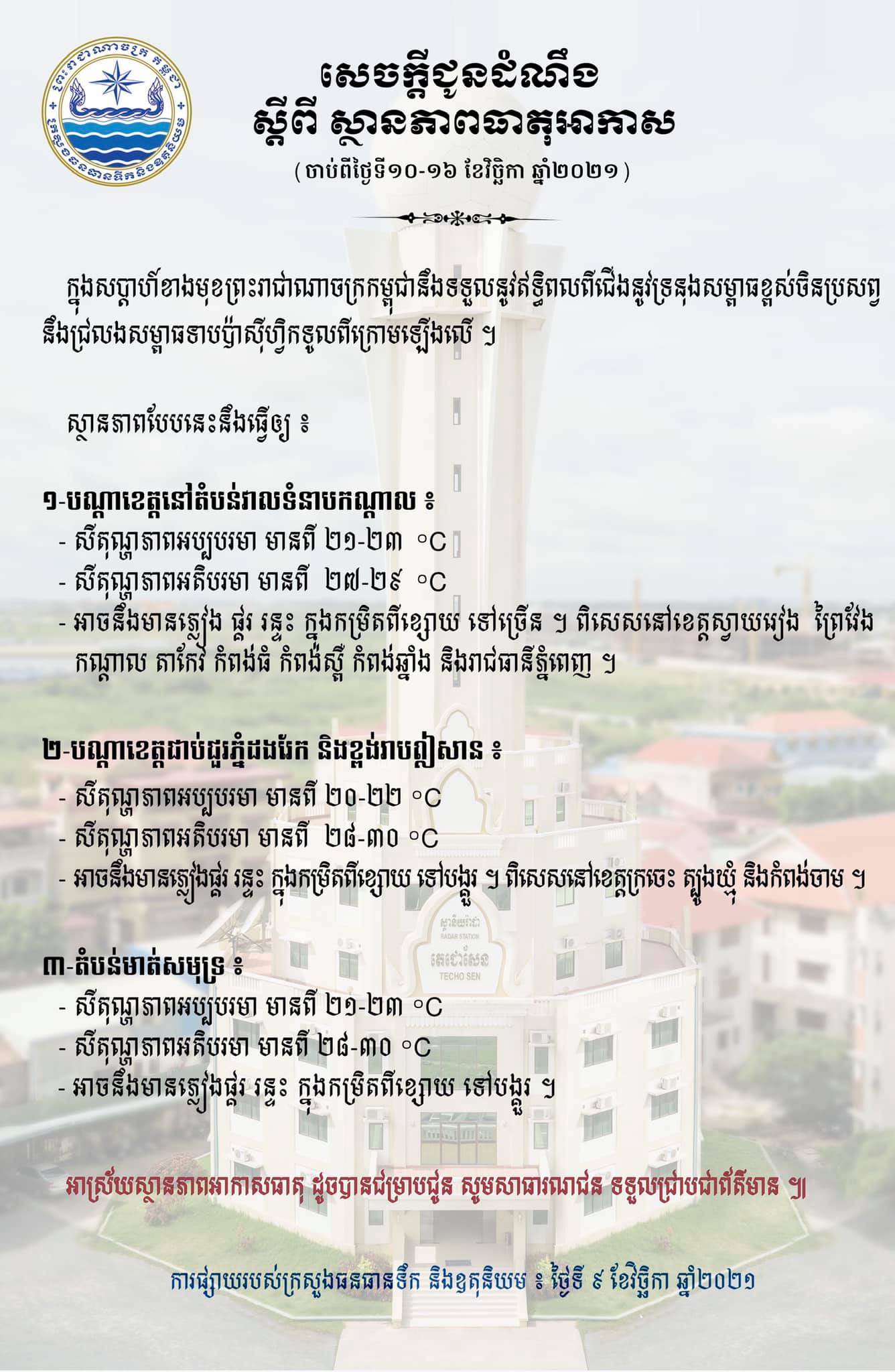 យោងតាមការបញ្ជាក់ពីក្រសួងធនធានទឹក និងឧតុនិយម ចាប់ពីថ្ងៃទី១០ ដល់ថ្ងៃទី១៦ ខែវិច្ឆិកា បានឲ្យដឹងថា ក្នុងសប្តាហ៍ខាងមុខនេះ ព្រះរាជាណាចក្រកម្ពុជានឹងទទួលឥទ្ធិពលពីជើងនូវទ្រនុងសម្ពាធខ្ពស់ចិនប្រសព្វនឹងជ្រលងសម្ពាធទាបប៉ាស៊ីហ្វិកទួលពីក្រោមឡើងលើ។ ស្ថានភាពបែបនេះនឹងធ្វើឲ្យ៖