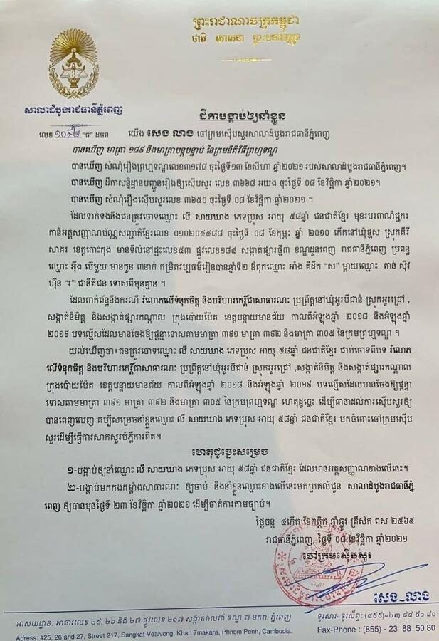 ២៖ បង្គាប់មកកងកម្លាំងសាធារណៈ ឱ្យចាប់ និងនាំខ្លួនឈ្មោះខាងលើនេះមកប្រគល់ជូនសាលាដំបូងរាជធានីភ្នំពេញ ឱ្យបានមុនថ្ងៃទី ២៣ ខែវិច្ឆិកា ឆ្នាំ២០២១ ដើម្បីចាត់ការតាមច្បាប់៕