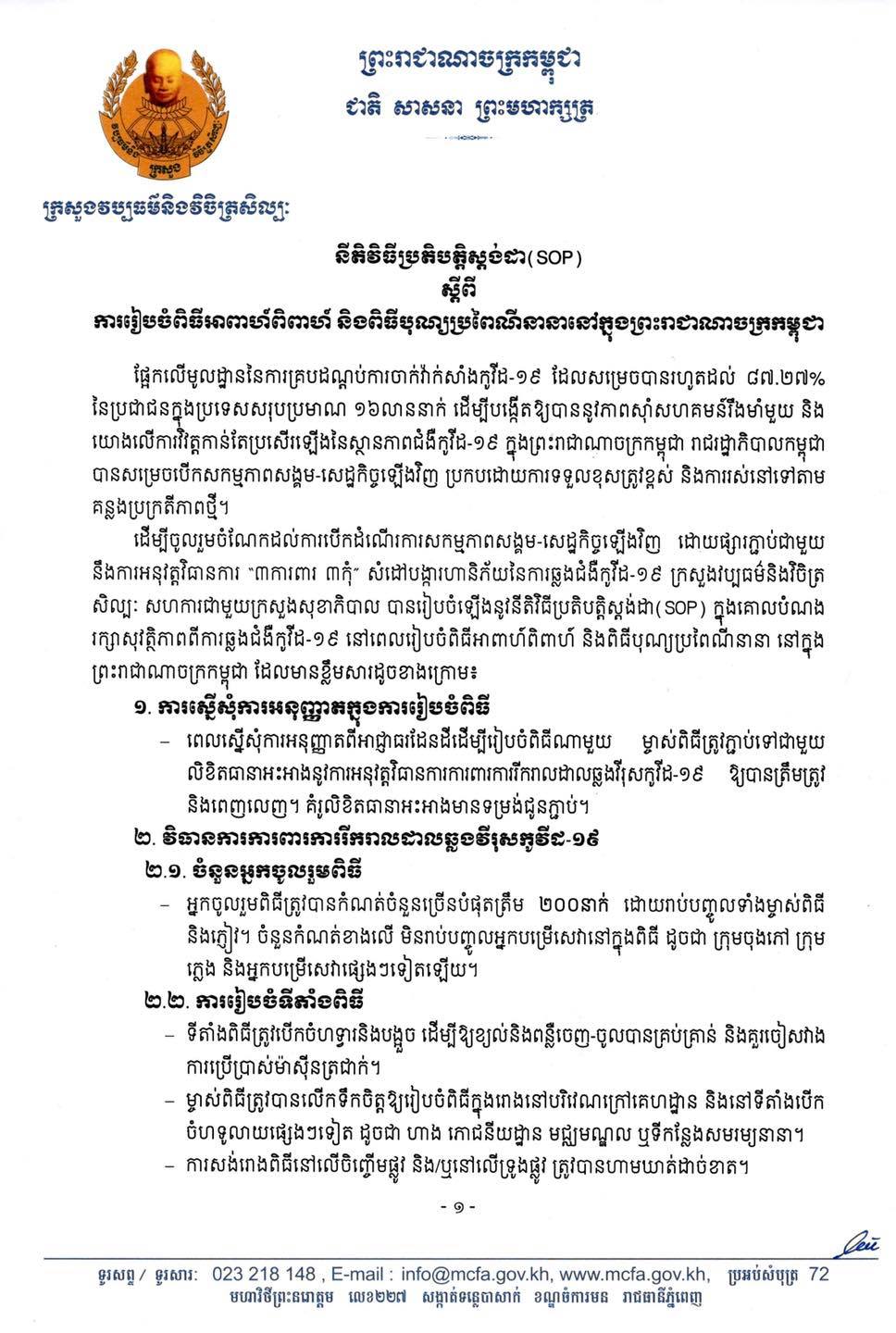 រាជធានីភ្នំពេញ៖ យោងតាមលិខិតរបស់ ក្រសួងវប្បធម៌ និងវិចិត្រសិល្បៈ បានចេញនីតិវិធីប្រតិបត្តិស្តង់ដា (SOP) ស្តីពីការរៀបចំពិធីអាពាហ៍ពិពាហ៍ និងពិធីបុណ្យប្រពៃណីនានា ក្នុងព្រះរាជាណាចក្រកម្ពុជា ដោយកំណត់ចំនួនអ្នកចូលរួម យ៉ាងច្រើនបំផុត ២០០នាក់។