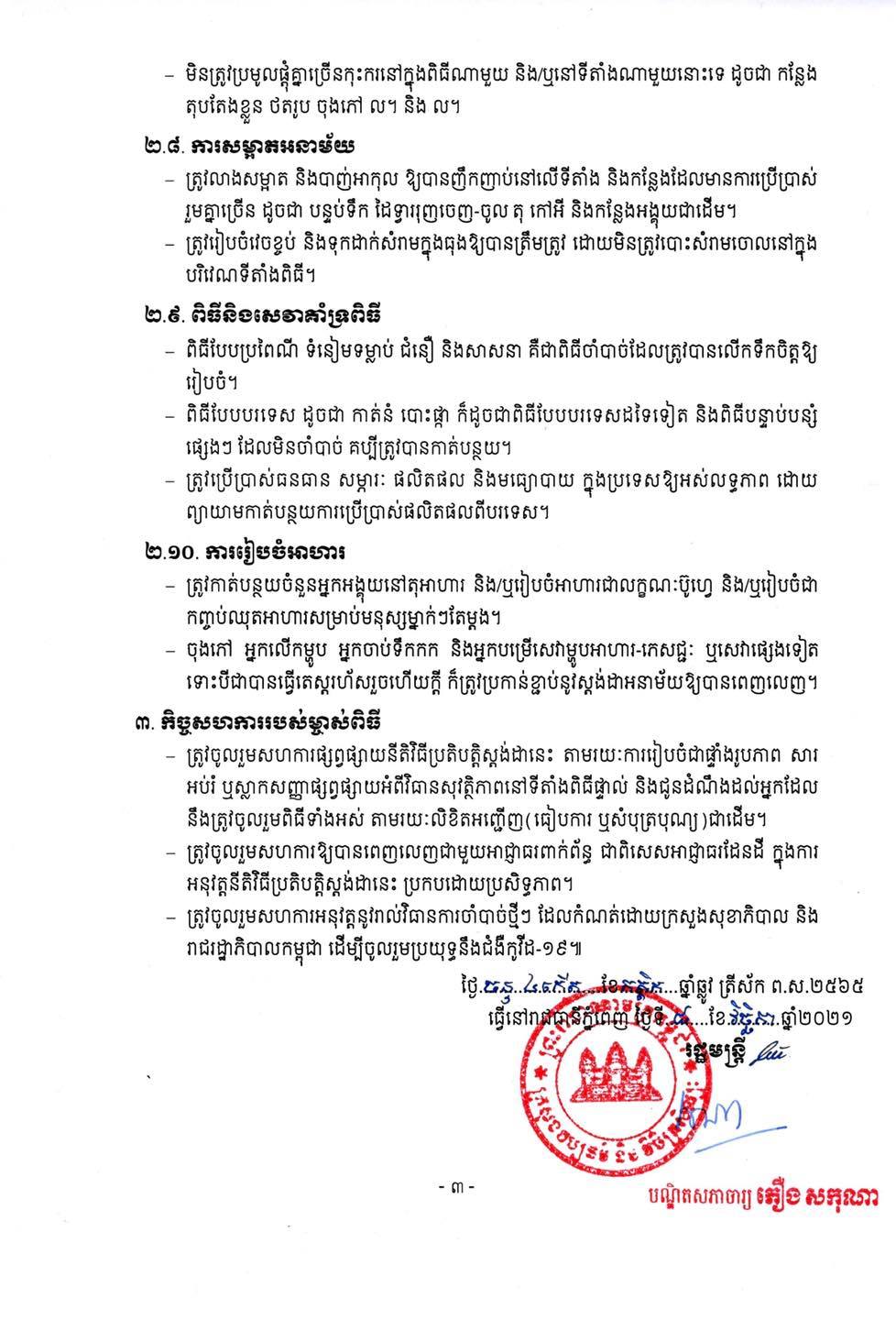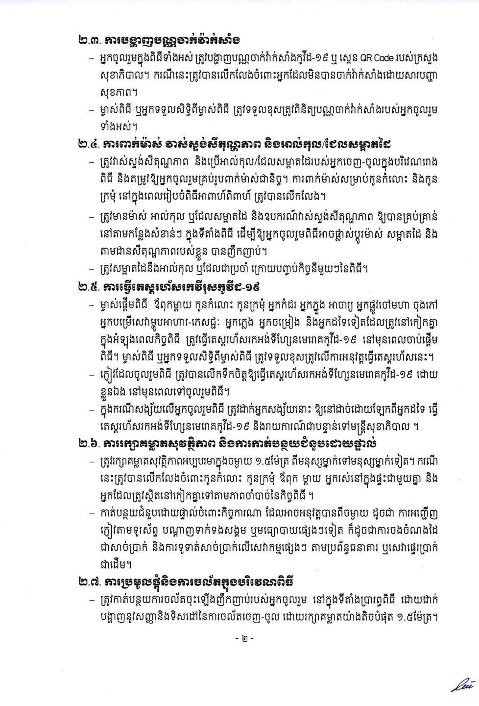 ក្រសួងក៏បានបញ្ជាក់ទៀតថា កាត់បន្ថយជំនួបដោយផ្ទាល់ចំពោះកិច្ចការណា ដែលអាចអនុវត្តបានពីចម្ងាយ ដូចជា៖ ការអញ្ជើញភ្ញៀវតាមទូរស័ព្ទ បណ្ដាញទាក់ទងសង្គម ឬមធ្យោបាយផ្សេងៗទៀត ក៏ដូចជាការចងចំណងដៃជាសាច់ប្រាក់ និងការទូទាត់សាច់ប្រាក់លើសេវាកម្មផ្សេងៗ តាមប្រព័ន្ធធនាគារ ឬសេវាផ្ទេរប្រាក់ជាដើម ៕