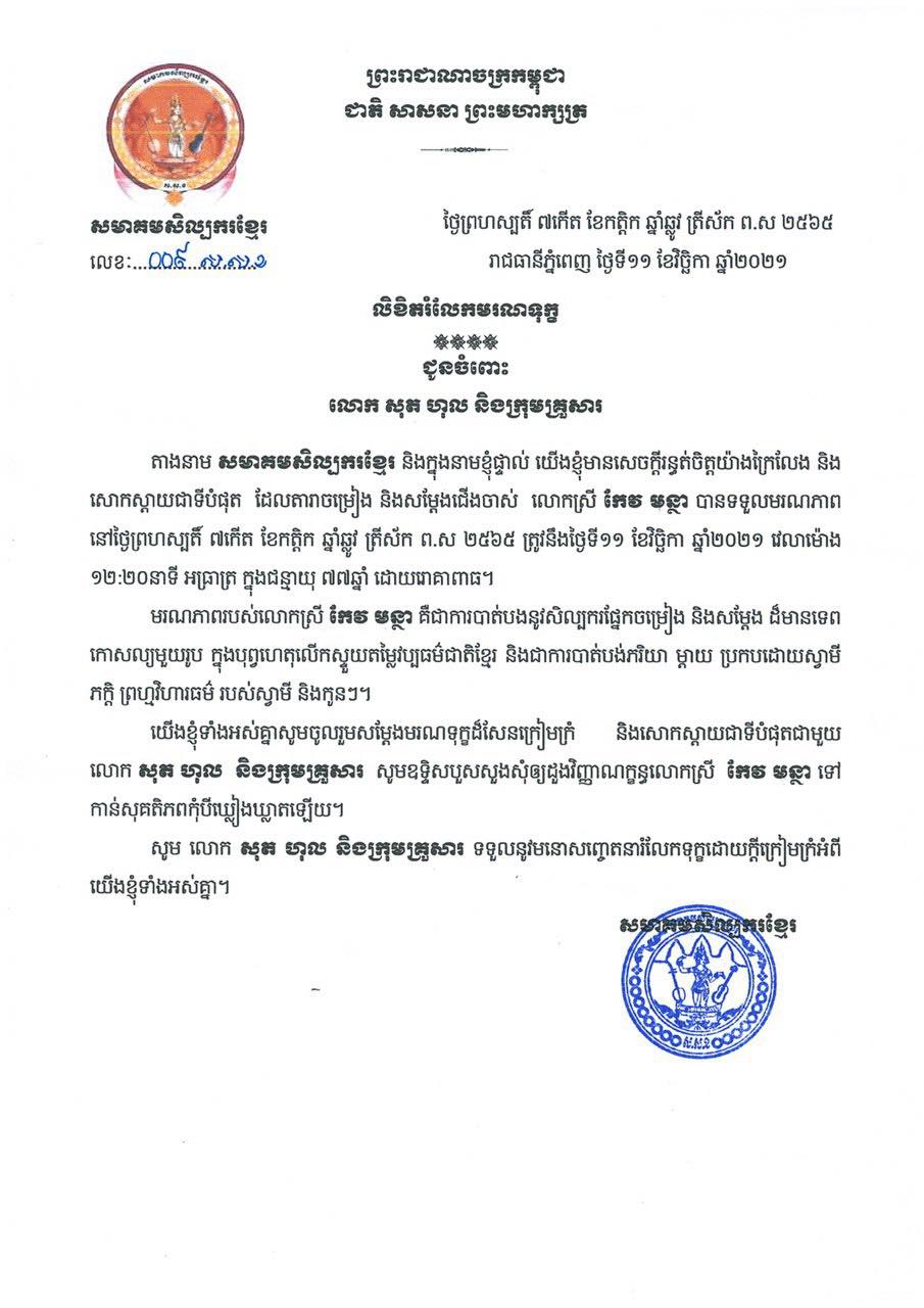 យើងខ្ញុំទាំងអស់គ្នាសូមចូលរួមសម្តែងមរណទុក្ខដ៏សែនក្រៀមក្រំ និងសោកស្តាយជាទីបំផុតជា មួយ លោក សុត ហុល និងក្រុមគ្រួសារ សូមឧទ្ទិសបួសសួងសុំឲ្យដួងវិញ្ញាណក្ខន្ធលោកស្រី កែវ មន្ថា ទៅកាន់សុគតិភពកុំបីឃ្លៀងឃ្លាតឡើយ។ សូម លោក សុត ហុល និងក្រុមគ្រួសារ ទទួលនូវមនោសញ្ចេតនារំលែកទុក្ខដោយក្តីក្រៀមក្រំអំពីយើងខ្ញុំទាំងអស់គ្នា។