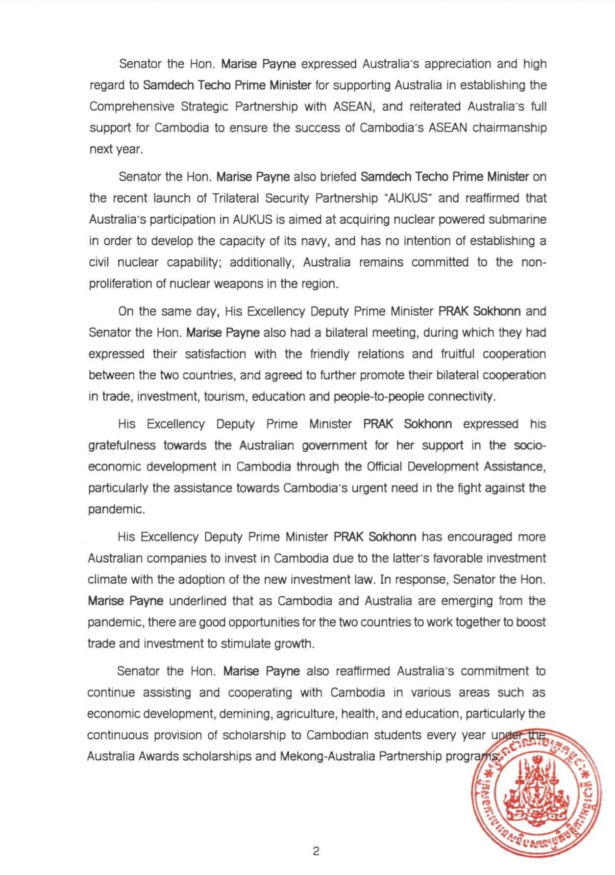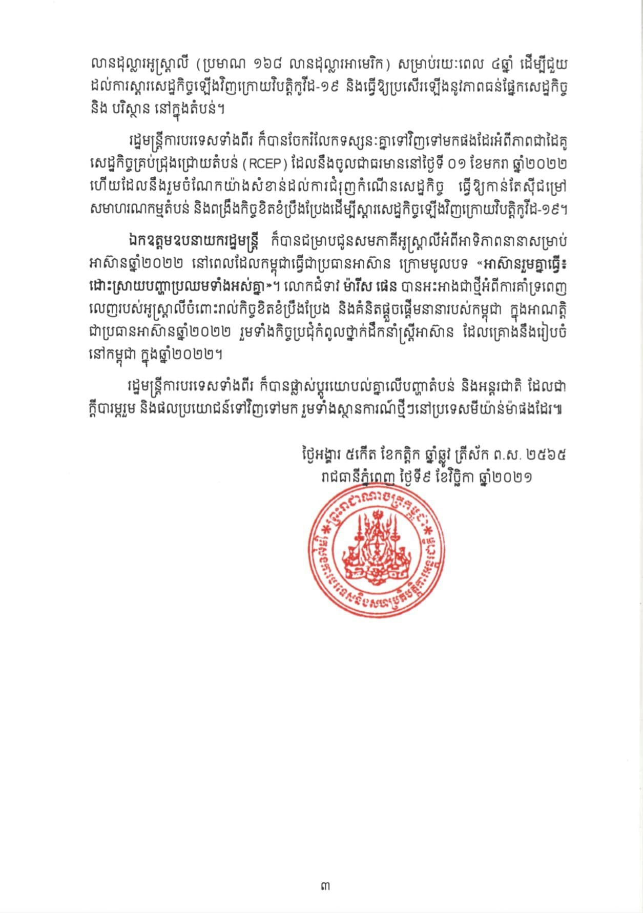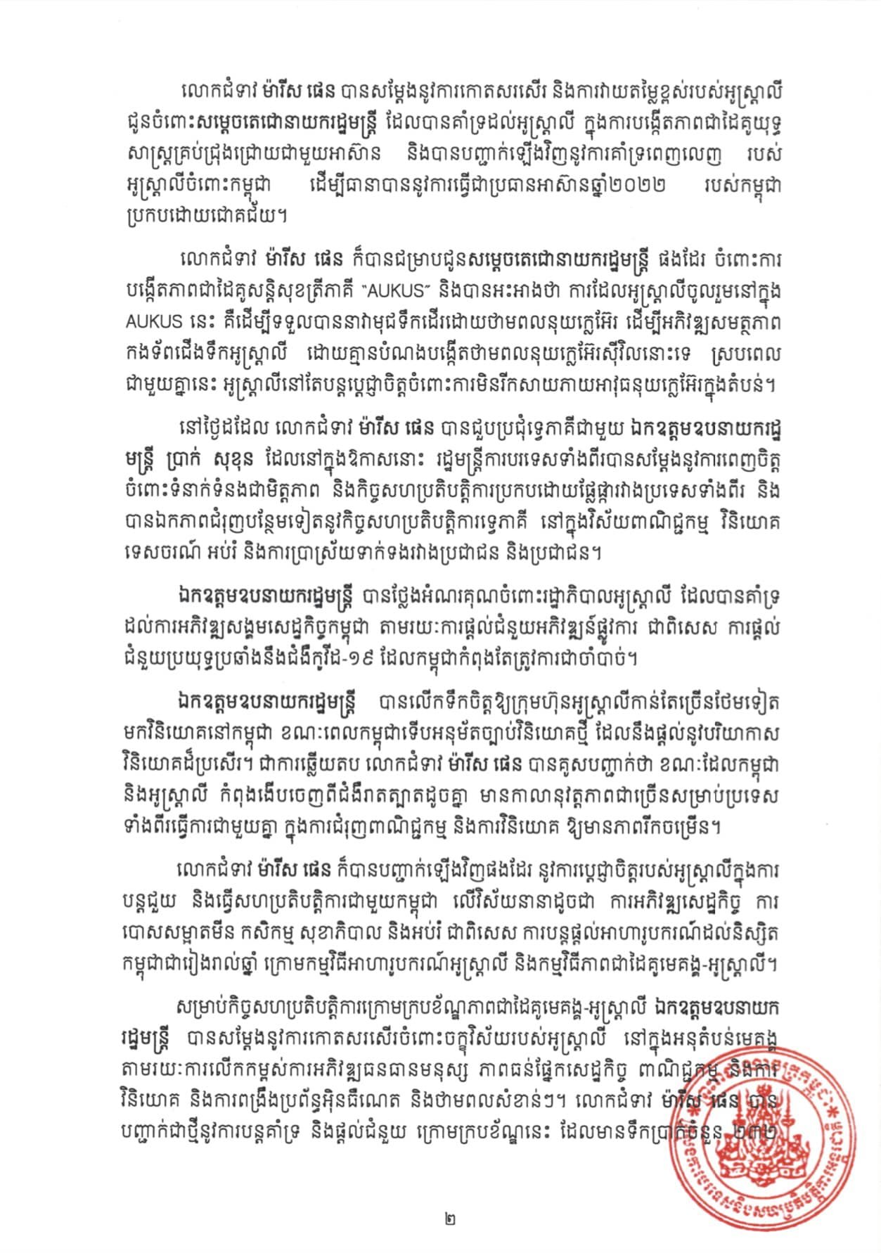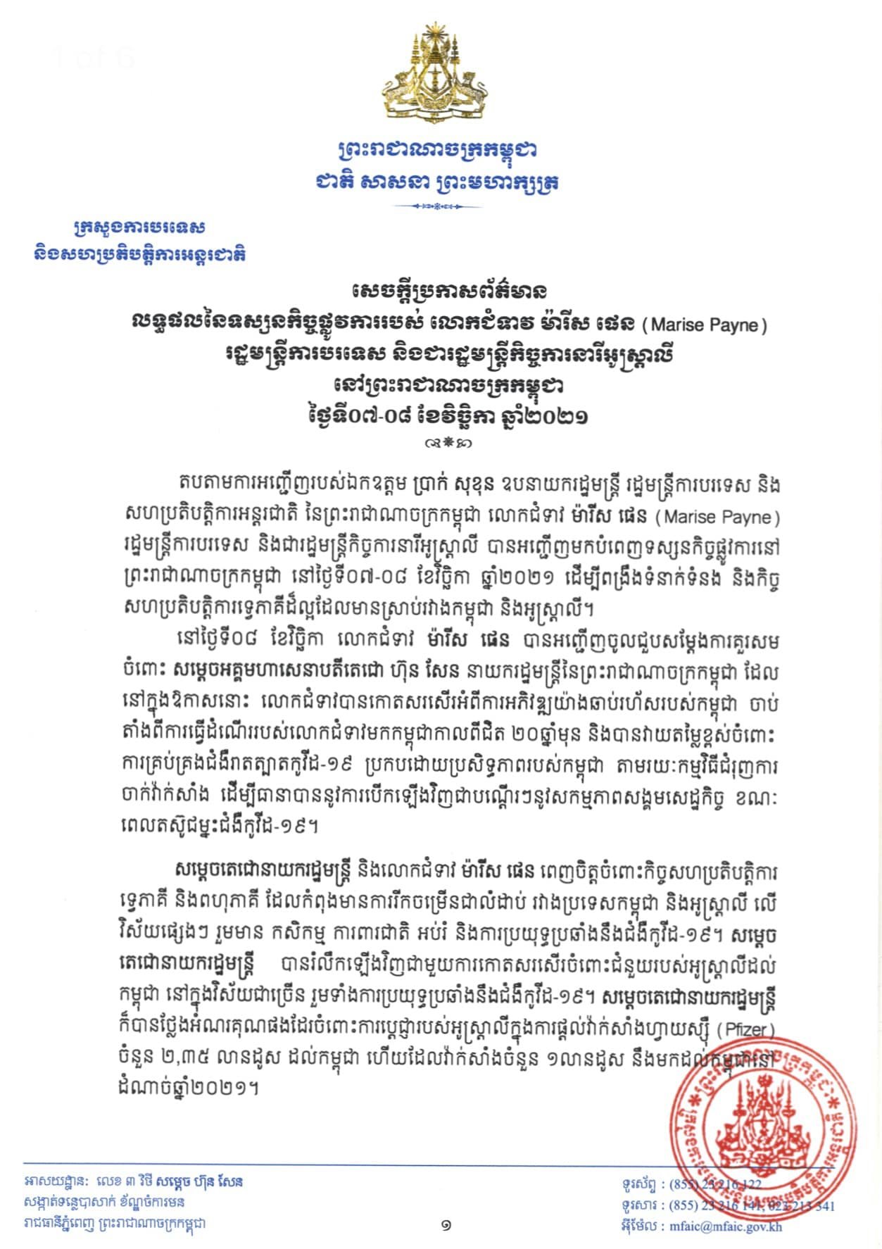 រាជធានីភ្នំពេញ៖ យោងតាមការចុះផ្សាយរបស់ ក្រសួងការបរទេស បានឲ្យដឹងថា លទ្ធផលនៃទស្សនកិច្ចផ្លូវការរបស់ លោកជំទាវ ម៉ារីស ផេន រដ្ឋមន្ត្រីការបរទេស និងជារដ្ឋមន្ត្រីកិច្ចការនារីអូស្ដ្រាលី នៅព្រះរាជាណាចក្រកម្ពុជា កាលពីថ្ងៃទី០៧-០៨ ខែវិច្ឆិកា ឆ្នាំ២០២១ ដើម្បីពង្រឹងទំនាក់ទំនង និងកិច្ចសហប្រតិបត្តិការទ្វេភាគីដ៏ល្អ ដែលមានស្រាប់រវាងកម្ពុជា និងអូស្ត្រាលី។