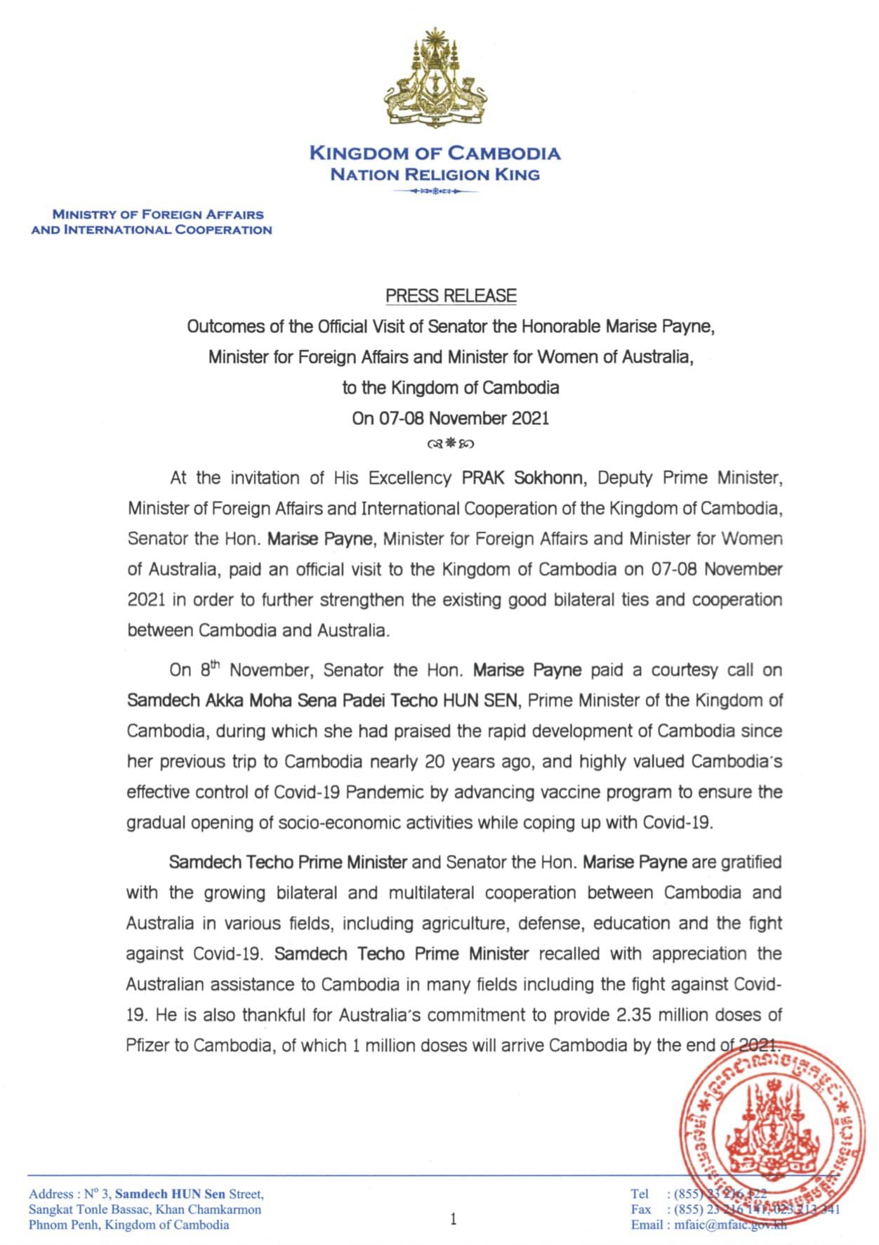 អូស្រ្តាលីផ្ដល់វ៉ាក់សាំងកូវីដ-១៩ Pfizer ចំនួន ២,៣៥លានដូសមកកម្ពុជា ខណៈវ៉ាក់សាំងចំនួន ១លានដូសនឹងមកដល់នៅដំណាច់ឆ្នាំនេះ