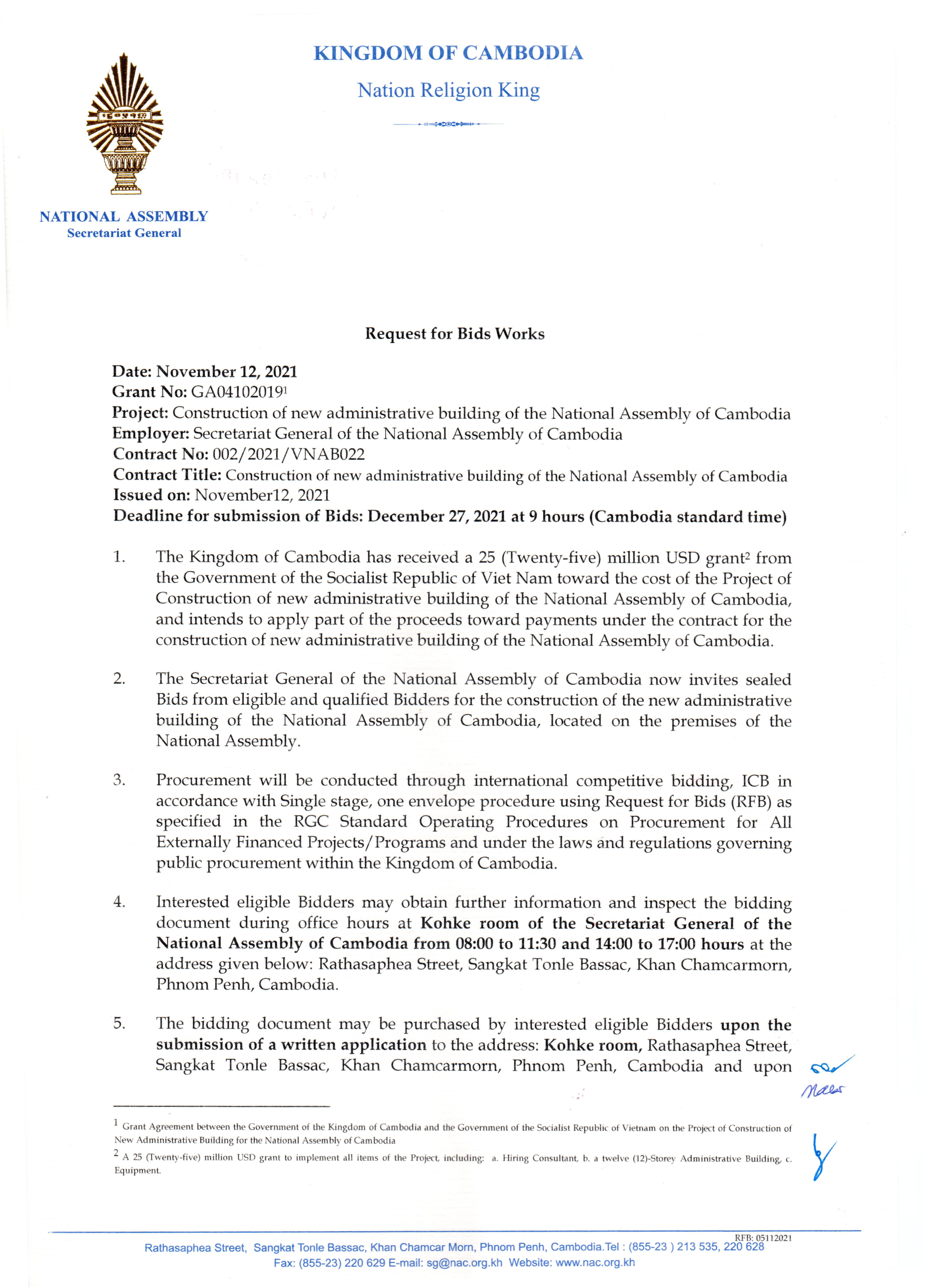 យោងតាមផេកផ្លូវការរបស់រដ្ឋសភា បានផ្សព្វផ្សាយឲ្យដឹងពីសេចក្តីជូនដំណឹងស្តីពីការអញ្ជើញចូលរួមដេញថ្លៃសម្រាប់គម្រោងសាងសង់អាគាររដ្ឋបាលថ្មី នៃរដ្ឋសភា នៃព្រះរាជាណាចក្រកម្ពុជា ក្រោមជំនួយឥតសំណងចំនួន២៥លានដុល្លារសហរដ្ឋអាមេរិក ដែលជាជំនួយរបស់រដ្ឋាភិបាល នៃសាធារណរដ្ឋសង្គមនិយមវៀតណាម។