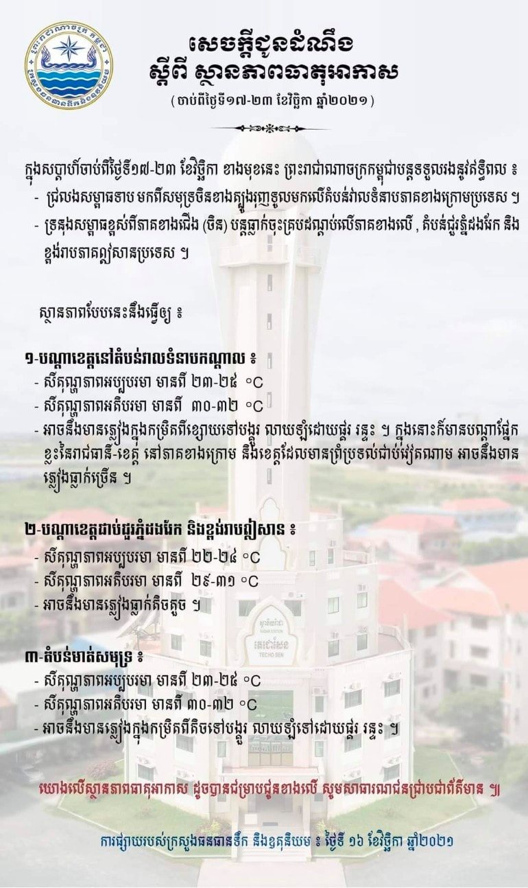 ដោយចាប់ពីថ្ងៃទី១០ ដល់ថ្ងៃទី១៦ ខែវិច្ឆិកា ឆ្នាំ២០២១ ព្រះរាជាណាចក្រកម្ពជា នឹងទទួលឥទ្ធិពលពីជើងនូវទ្រនុងសម្ពាធខ្ពស់ចិនប្រសព្វនឹងជ្រលងសម្ពាធទាបប៉ាស៊ីហ្វិកទូលពីក្រោមឡើងលើ។ ស្ថានភាពបែបនេះនឹងធ្វើឲ្យបណ្ដាខេត្តនៅតំបន់វាលទំនាបកណ្ដាល បណ្ដាខេត្តជាប់ជួរភ្នំដងរែក និងខ្ពស់រាប រួមនឹងតំបន់មាត់សមុទ្រ អាចនឹងមានភ្លៀង ផ្គរ រន្ទះ ក្នុងកម្រិតខ្សោយទៅច្រើន។ ជាក់ស្តែងនៅក្នុងខេត្តពោធិ៍សាត់​ស្ថានភាពទឹកស្ទឹងពោធិ៍សាត់ មានកំពស់ទឹកបានកើនឡើងក្នុងកម្រិតមួយដែលត្រូវប្រកាសអាសន្ន។