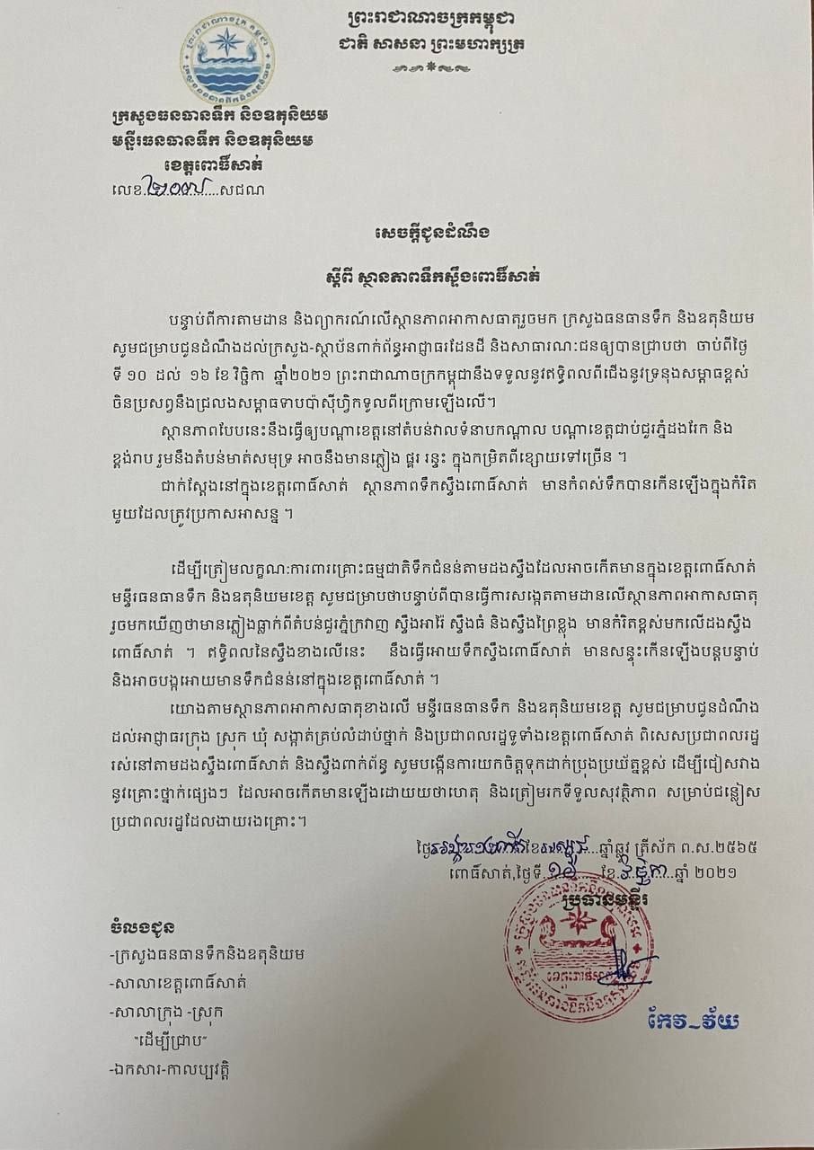 ខេត្តពោធិ៍សាត់៖ យោងតាមសេចក្ដីជូនដំណឹងរបស់ មន្ទីរក្រសួងធនធានទឹក និងឧតុនិយមខេត្តពោធិ៍សាត់ នៅថ្ងៃទី១៦ ខែវិច្ឆិកា ឆ្នាំ២០២១ បានឲ្យដឹងថា កម្រិតទឹកស្ទឹងពោធិ៍សាត់ ឡើងដល់កម្រិតប្រកាសអាសន្នហើយ និងសូមពលរដ្ឋបង្កើនការប្រុងប្រយ័ត្នខ្ពស់។