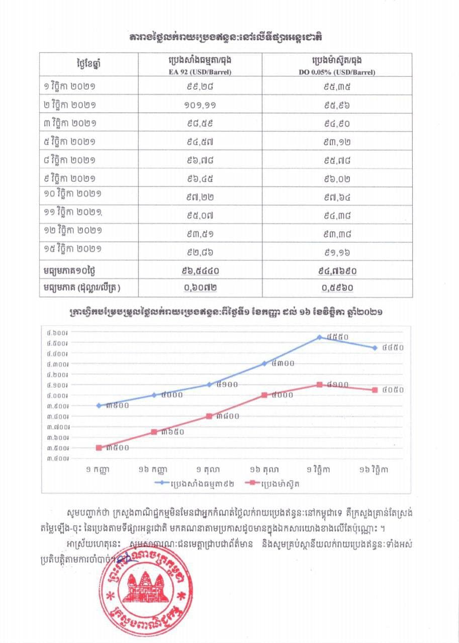 រាជធានីភ្នំពេញ៖ យោងតាមលិខិតរបស់ក្រសួងពាណិជ្ជកម្ម ចុះផ្សាយថ្ងៃទី១៦ ខែវិច្ឆិកា ឆ្នាំ២០២១ ស្តីអំពីតម្លៃលក់រាយប្រេងឥន្ធនៈនៅតាមស្ថានីយទាំងអស់ក្នុងព្រះរាជាណាចក្រកម្ពុជាសម្រាប់អនុវត្តទៅតាមតម្លៃមធ្យមប្រេងឥន្ធនៈលើទីផ្សារអន្តរជាតិ ចាប់ពីថ្ងៃទី១៦ ដល់ថ្ងៃទី៣០ ខែវិច្ឆិកា ឆ្នាំ២០២១ បានឲ្យដឹងថា តម្លៃប្រេងសាំងធម្មតាមានតម្លៃ ៤,៤៥០រៀលក្នុងមួយលីត្រ ចំណែកឯប្រេងសាំងម៉ាស៊ូតមានតម្លៃ ៤,០៥០រៀលក្នុងមួយលីត្រប៉ុណ្ណោះ។