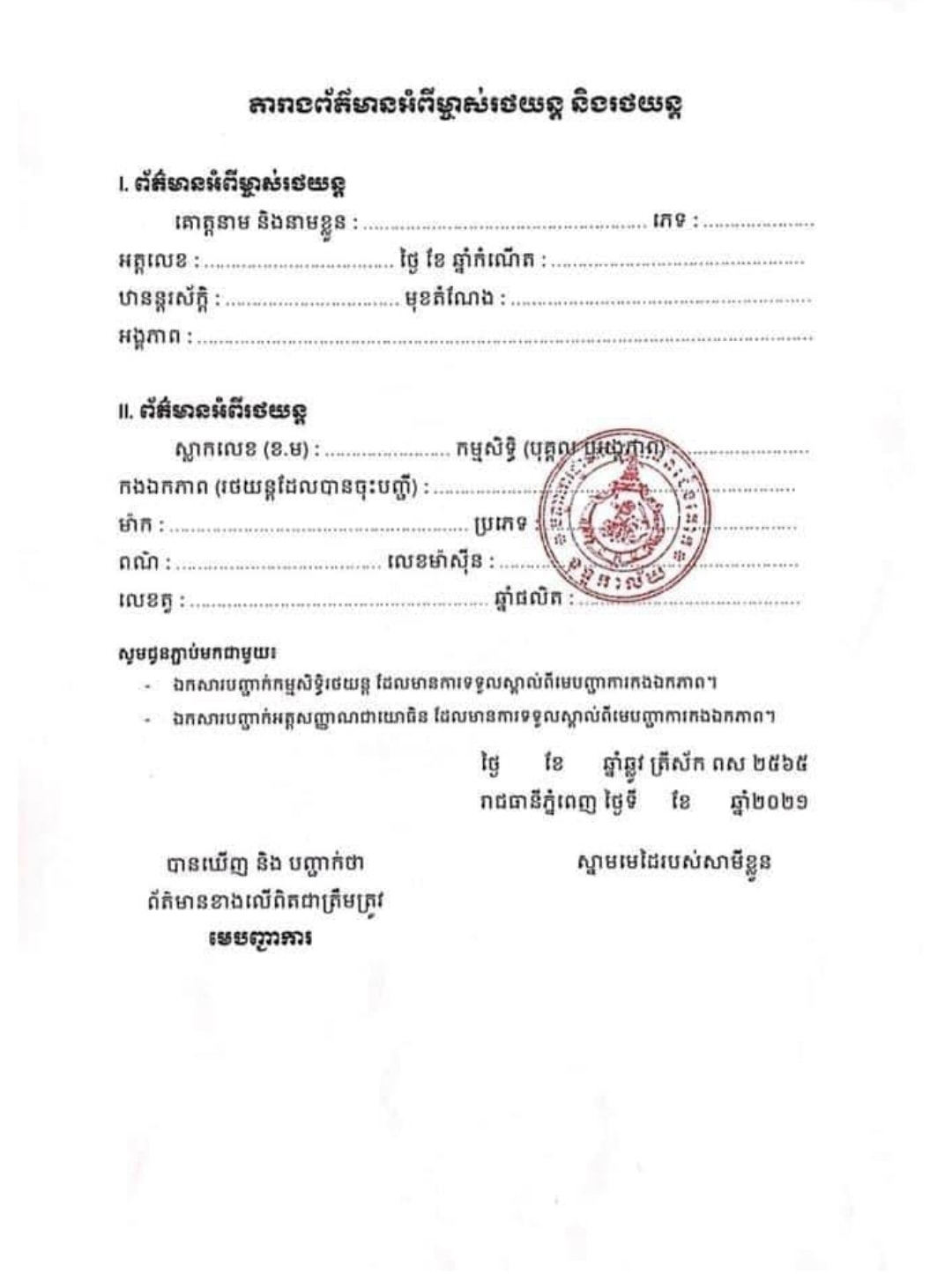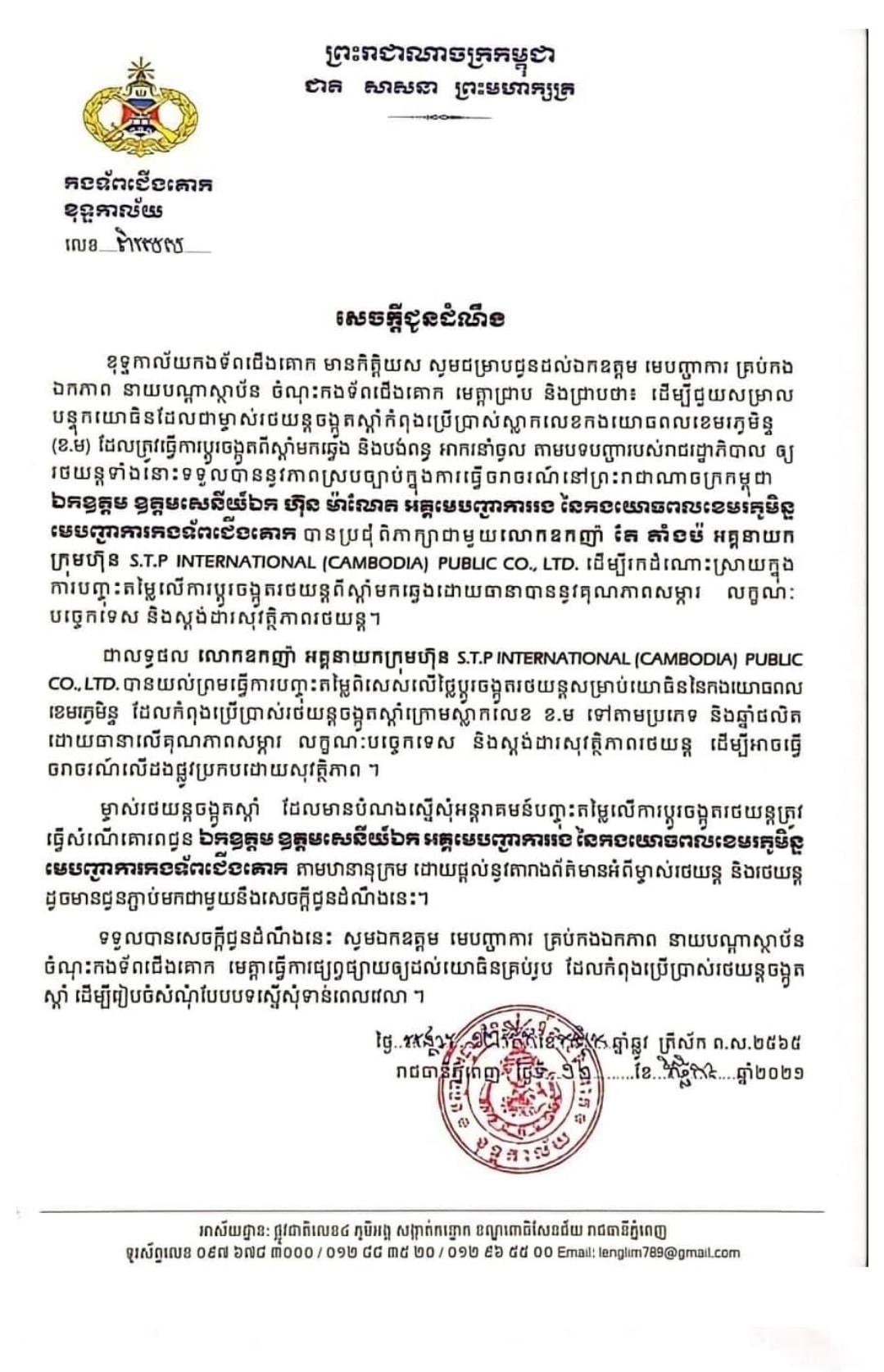 សេចក្ដីជូនដំណឹងដដែលបានបន្តថា ម្ចាស់រថយន្តដែលមានបំណងស្នើសុំអន្តរាគមន៍បញ្ចុះតម្លៃលើការប្តូរចង្កូត រថយន្ត ត្រូវធ្វើសំណើមកកាន់ ឯកឧត្តម ឧត្តមសេនីយ៍ឯក ហ៊ុន ម៉ាណែត ដើម្បីបំពេញលក្ខខណ្ឌទទួលបានការបញ្ចុះ តម្លៃនេះ៕