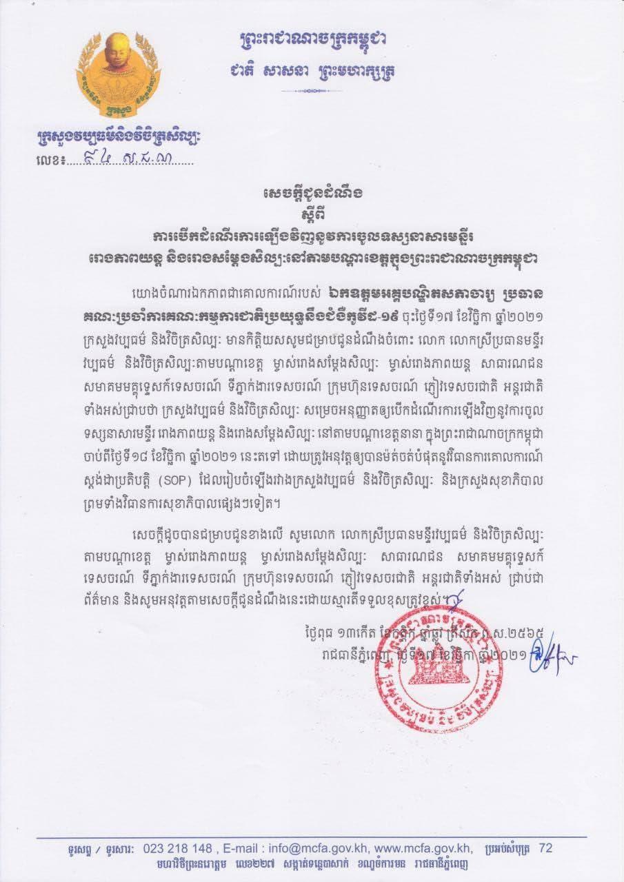 ក្រសួងវប្បធម៌ និងវិចិត្រសិល្បៈ បានឲ្យដឹងថា សម្រេចអនុញ្ញាតឲ្យបើកដំណើរការឡើងវិញនូវការចូលទស្សនាសារមន្ទីរ រោងភាពយន្ត និងរោងសម្តែងសិល្បៈ នៅតាមបណ្តាខេត្តនានា ក្នុងព្រះរាជាណាចក្រកម្ពុជា ចាប់ពីថ្ងៃទី១៨ ខែវិច្ឆិកា ឆ្នាំ២០២១ នេះតទៅ ដោយត្រូវអនុវត្តឲ្យបានម៉ត់ចត់បំផុត នូវវិធានការគោលការណ៍ស្តង់ដាប្រតិបត្តិ (SOP) ដែលរៀបចំឡើងរវាងក្រសួងវប្បធម៌ និងវិចិត្រសិល្បៈ និងក្រសួងសុខាភិបាល ព្រមទាំងវិធានការសុខាភិបាលផ្សេងៗទៀត។