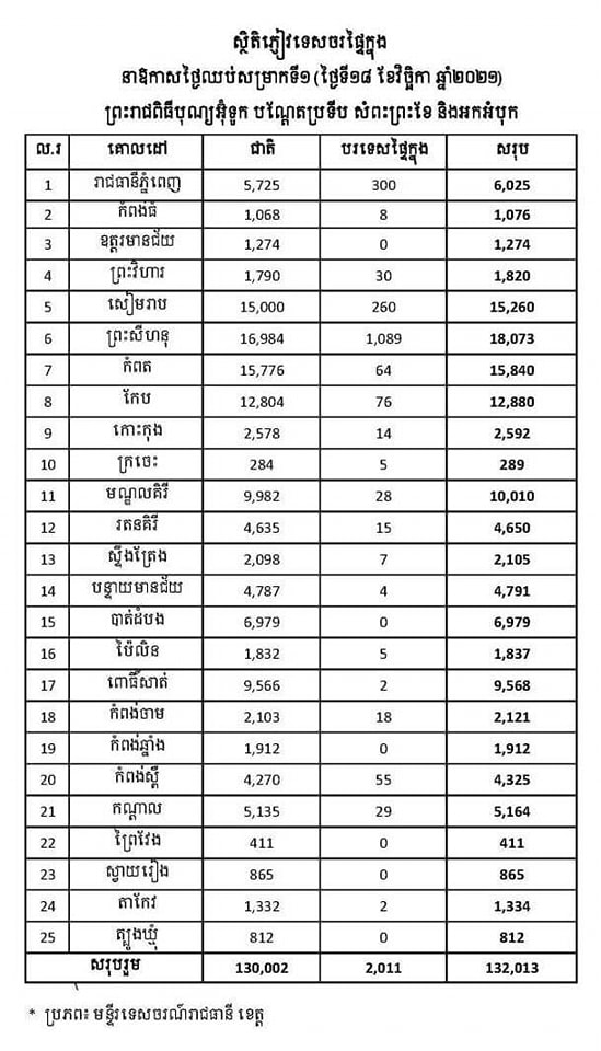 រាជធានីភ្នំពេញ៖ យោងតាមការចុះផ្សាយរបស់ ក្រសួងទេសចរណ៍ នៅថ្ងៃទី១៩ ខែវិច្ឆិកា ឆ្នាំ២០២១ បានឲ្យដឹងថា ក្នុងនាឱកាសថ្ងៃឈប់សម្រាកទី១ នៃព្រះរាជពិធីបុណ្យអុំទូក បណ្តែតប្រទីប និងសំពះព្រះខែ អកអំបុក ដែលត្រូវនឹងថ្ងៃទី១៨ ខែវិច្ឆិកា ឆ្នាំ២០២១នេះ នៅទូទាំងប្រទេសកម្ពុជាមានភ្ញៀវទេសចរចេញដើរលេងកម្សាន្តសរុប១៣២,០១៣នាក់ ក្នុងនោះមានភ្ញៀវជាតិ១៣០,០០២នាក់ និងភ្ញៀវបរទេសផ្ទៃក្នុង២,០១១នាក់។